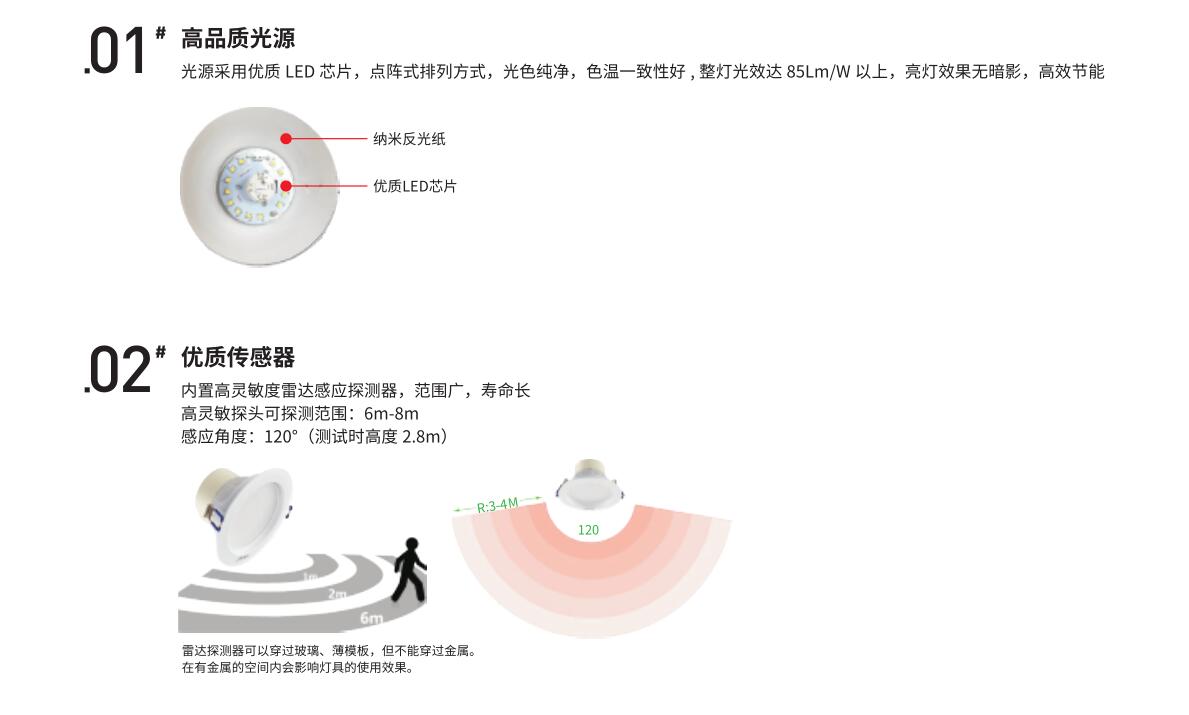 内置高灵敏度雷达感应探测器,范围广,寿命长;