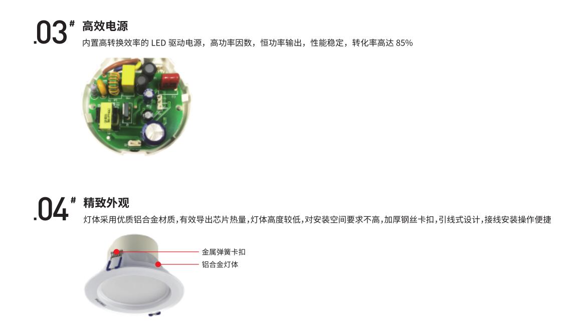 整灯光效达 85Lm/W 以上,亮灯效果无暗影,高效节能;