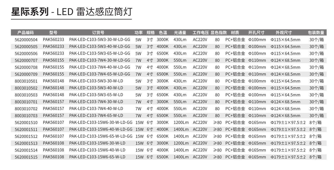 | PAK560416 | LED筒灯 星际 5W 4000K 3寸 白色 雷达感应 无光感 | PAK-LED-C103-5W3-40-W-LD2 |