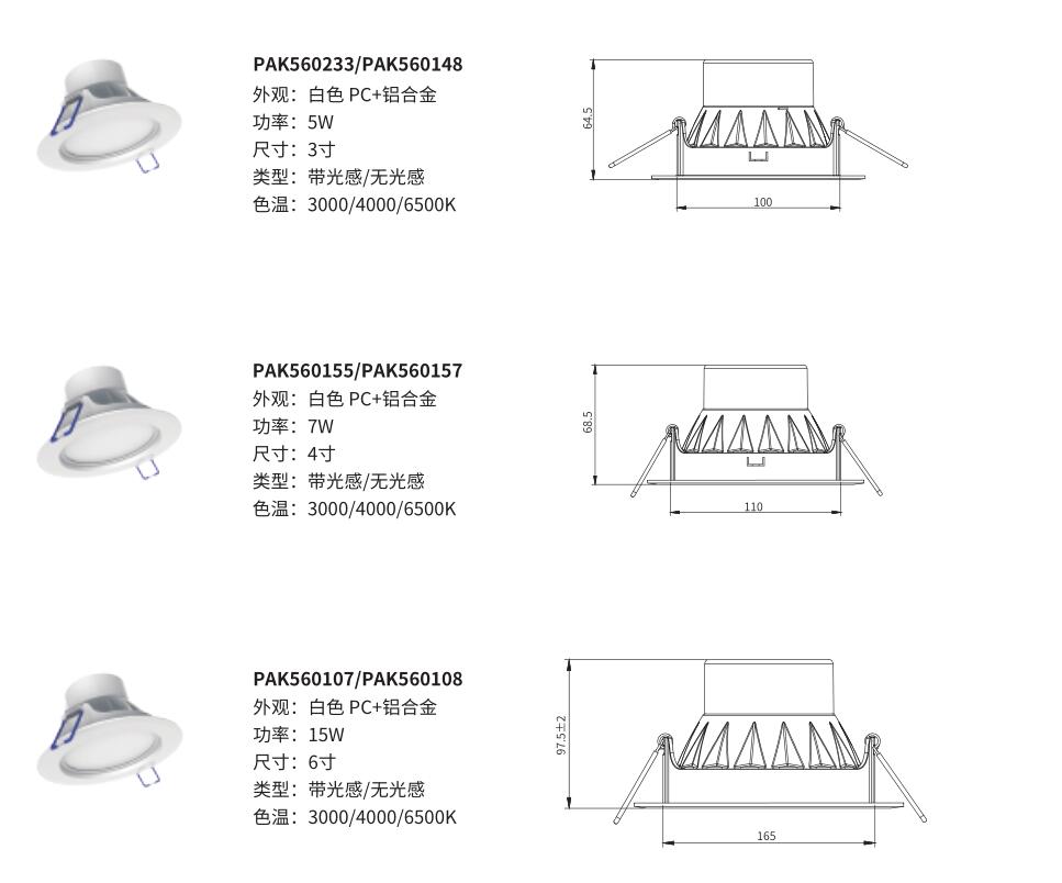 | PAK560416 | LED筒灯 星际 5W 6500K 3寸 白色 雷达感应 无光感 | PAK-LED-C103-5W3-65-W-LD2 |