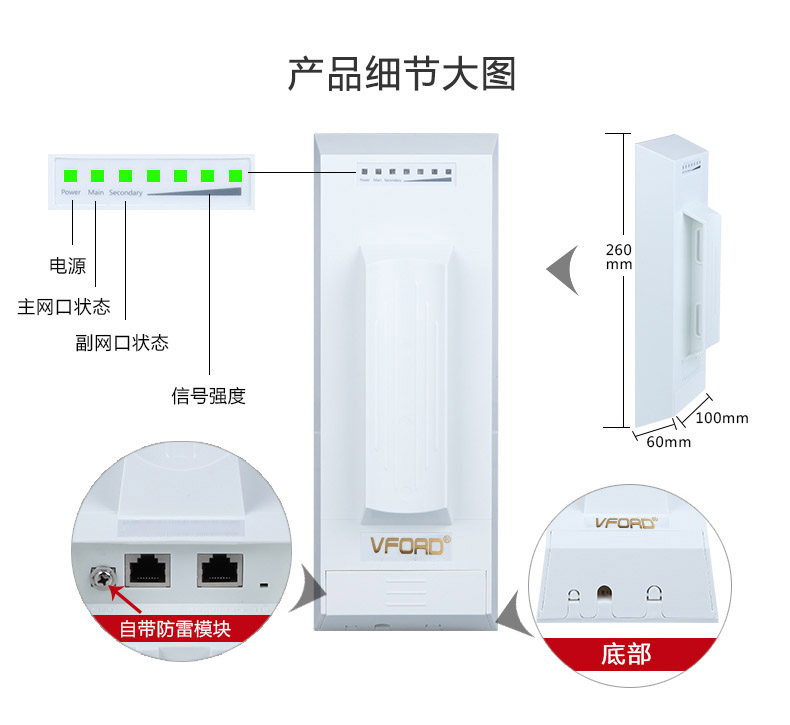 VS-5616 是伟福特公司新推出的应用于 IEEE 802.11a/n 技术的无线产品,实测吞吐量可达 150Mbps 以上。VS-5616 产品使用了 2×2 MIMO 技术和工业级高通芯片方案,将提供比以往更高速度、更远距离的无线链路传输,外部通过网线 PoE 方式供电,整个设备(包括内置天线)仅仅为 26×10×150px 大小,重量仅仅为 0.4kg。