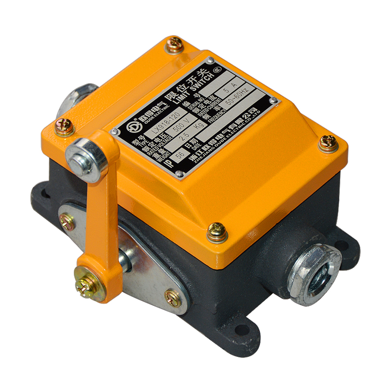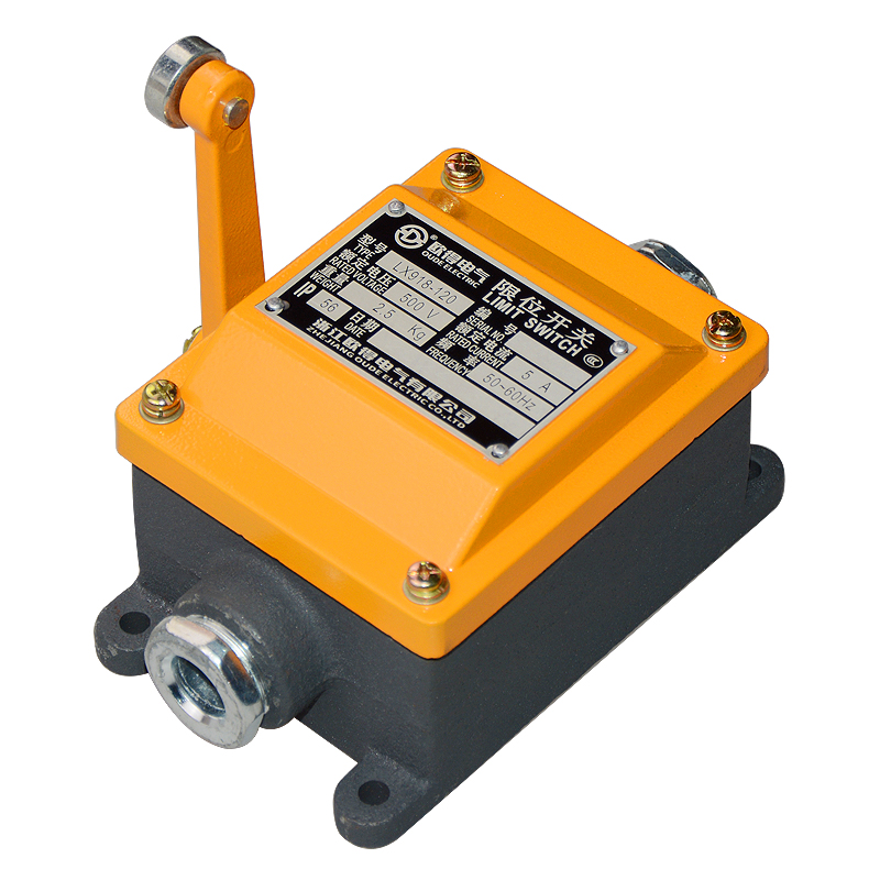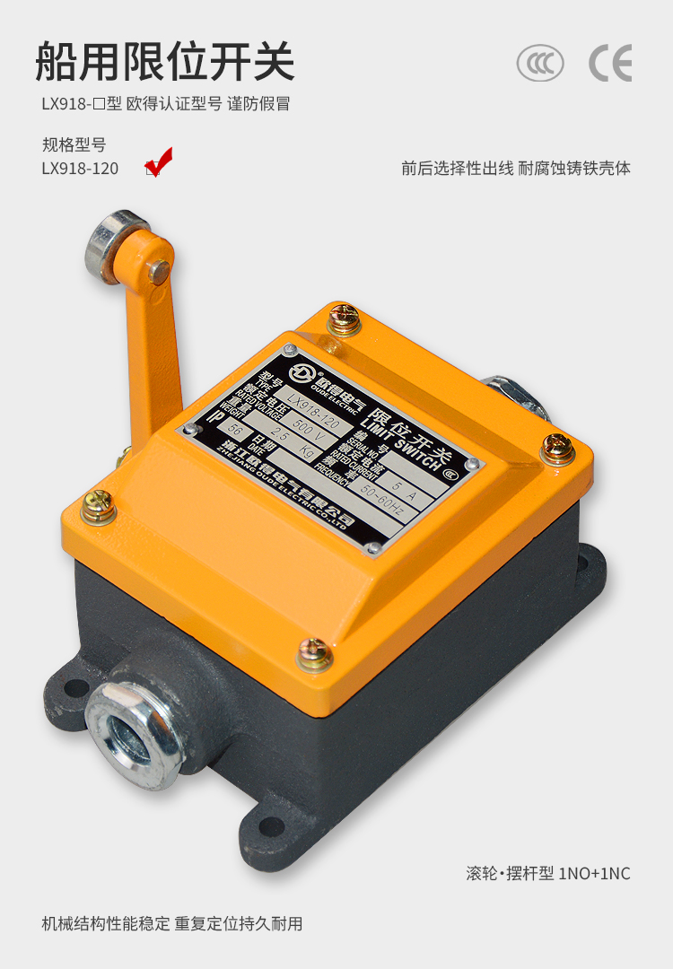 船用限位开关(LX918-120),滚轮摆杆式,2回路型,1常开1常闭。额定绝缘电压400伏,发热电流10安培,工作电压电流交流380伏、2.6安培,直流220伏、0.4安培,防护等级IP56。