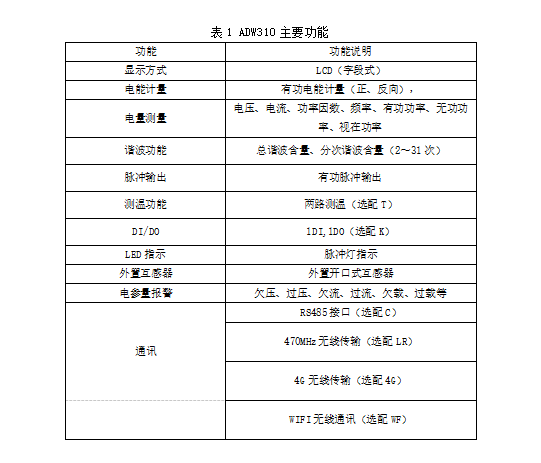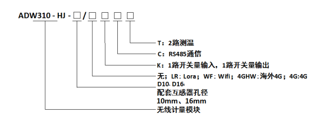1. 概述ADW310 无线计量仪表主要用于计量低压网络的有功电能,具有体积小、精度高、功能丰富等优点,并且可选通讯方式多,可支持 RS485 通讯和 Lora、4G 等无线通讯方式,增加了外置互感器的电流采样模式,从而方便用户在不同场合进行安装使用。可灵活安装于配电箱内,实现对不同区域和不同负荷的电能计量、运维监管或电力监控等需求.2.ADW310无线计量仪表命名规则 :