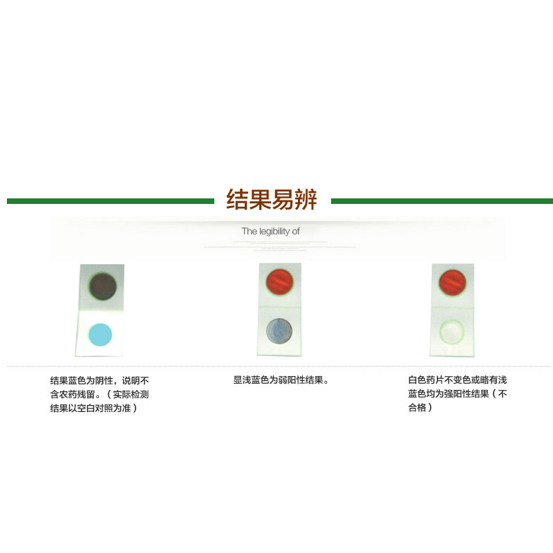 检测卡配套提供标准比色卡和操作说明书,用户可通过对照色阶准确判定农药残留水平,符合GB/T 5009.199-2003检测标准。