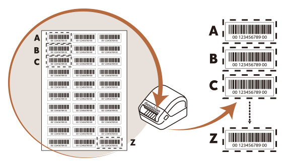 Brother QL-1100系列的自动裁切功能可在A4/Letter尺寸的纸张上自动识别和裁切各个标签(包括条形码)并逐个打印标签。