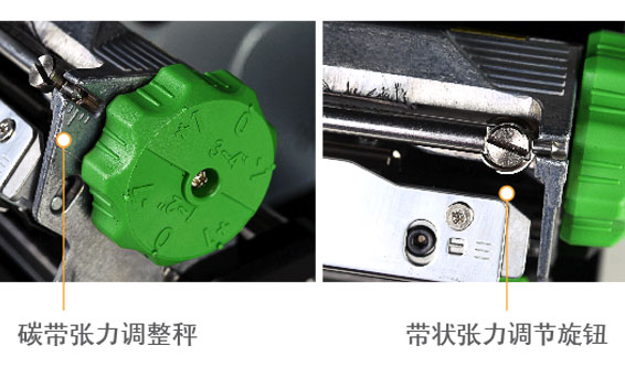 为了避免标签起皱,用户可以调整碳带张力使用碳带张力调节旋钮。碳带褶皱与介质宽度、厚度、打印头压力平衡、色带膜特性、打印浓度设置等。如果出现碳带褶皱,请按照说明调整打印机部件。