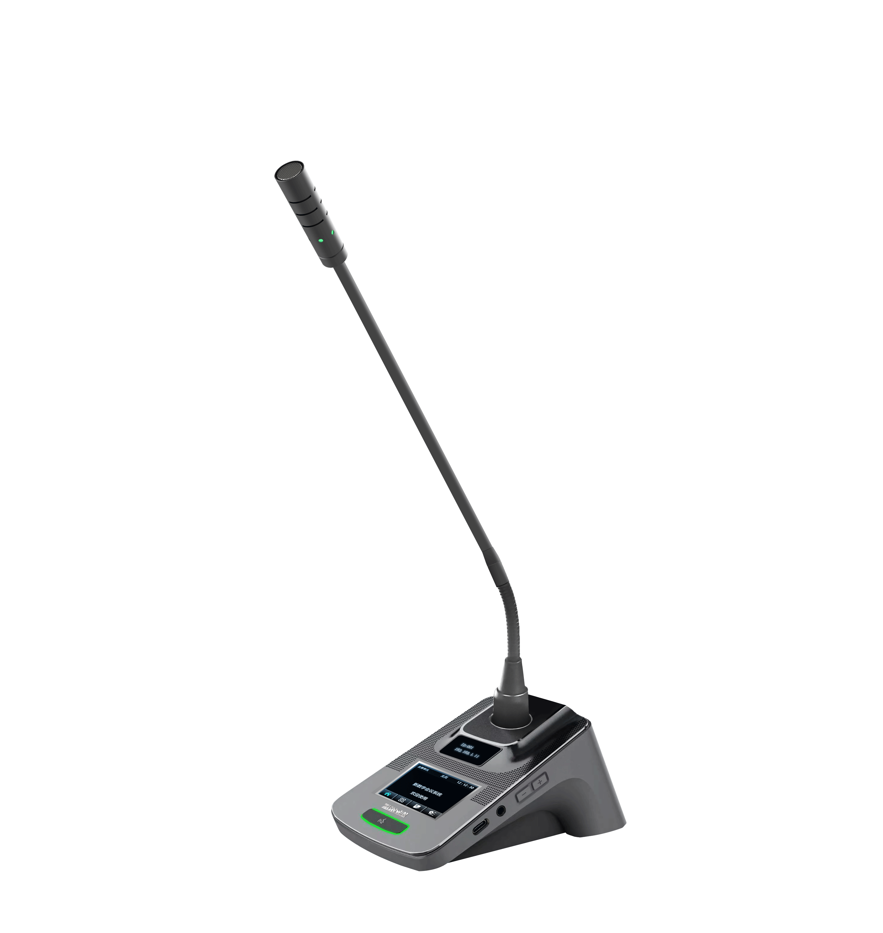 主机带有4.3寸彩屏,可在彩屏调节音量大小以及会议模式、单元限制、网络设置、出厂设置;