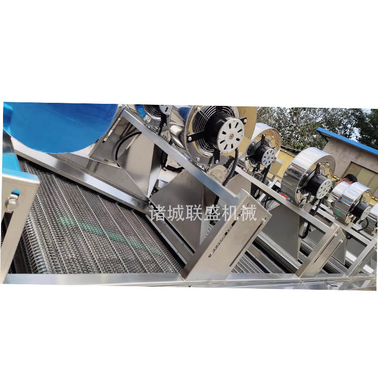 物料通过网带传输进入,经多次翻转,以实现物料的多面受风及受风的均匀性,通过离心风机的高压风力将食品冷却或将表面水分吹干,风嘴成风刀状,有效地提高了风量压力,使物料表面的水分在短时间内吹走或蒸发,便于储藏或深加工。