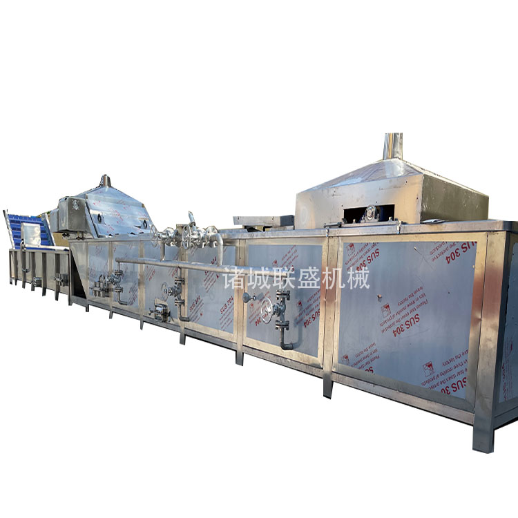 采用巴氏杀菌法,对酸豆角、酱菜、鸡爪、海带等各类包装产品、蔬菜或罐装食品通过温度自动调节将杀菌槽中的热水温度控制65-98摄氏度之间,既能起到杀菌效果,又能保证蛋白质等营养成分不在较大温差范围内波动,保持食品原有的品质,达到对食品不加防腐剂和添加剂,而延长保质期,从而保护了人们的生命健康,同时对杀菌后的物品通过冷却水进行冷却,并用强风将包装物表面吹干后包装入库,可延长食品贮藏期。