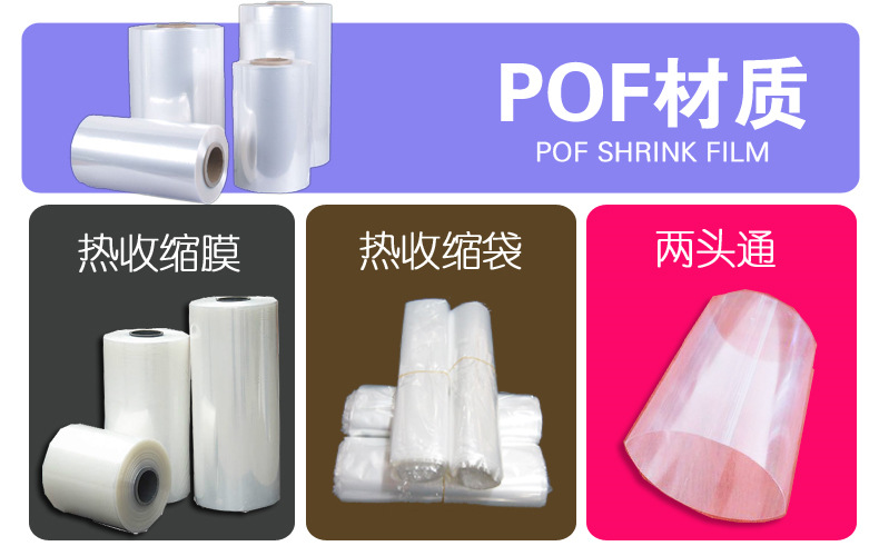 POF热收缩膜主要用于包装规则和不规则形状的产品,由于其无毒环保、高透明度、高收缩率、良好的热封性能,高光泽度、强韧性、抗撕裂、热收缩均匀及适合全自动高速包装等特点,是传统PVC收缩膜的换代产品,广泛应用于汽车用品,塑料制品,文具,书本,电子,线路板,MP3,VCD,工艺品,相框等木制品,玩具,杀虫剂,日用品,食品,化妆品,罐装饮料,乳制品,医药,盒带及录像带等产品。