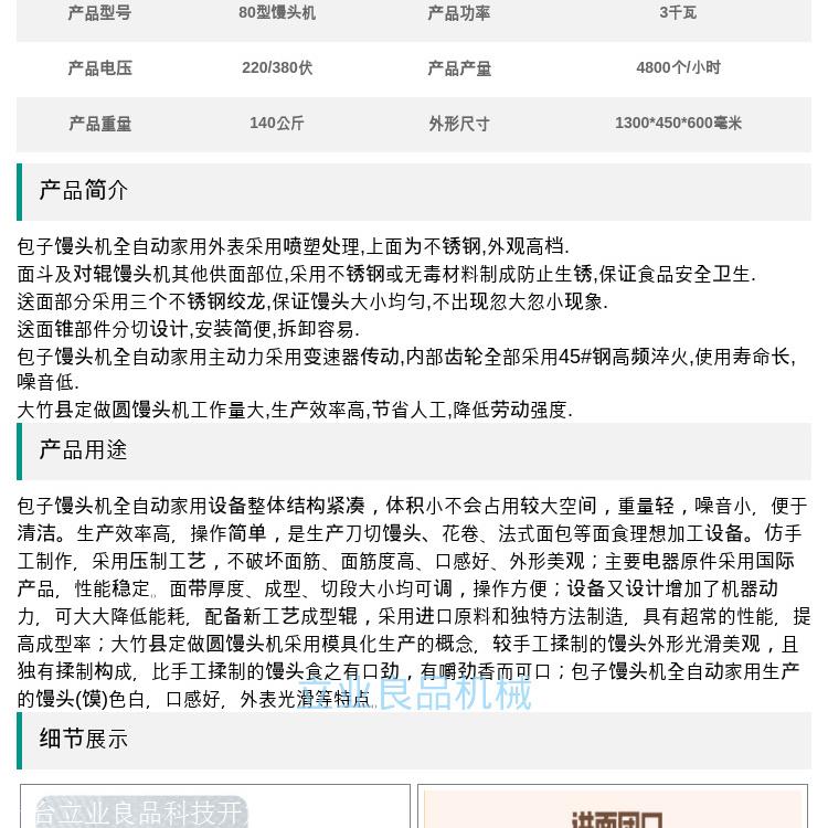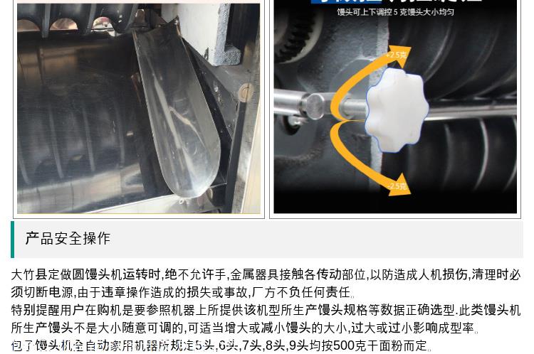 包子馒头机全自动家用外表采用喷塑处理,上面为不锈钢,外观高档.面斗及对辊馒头机其他供面部位,采用不锈钢或无毒材料制成防止生锈,保证食品安全卫生.送面部分采用三个不锈钢绞龙,保证馒头大小均匀,不出现忽大忽小现象.送面锥部件分切设计,安装简便,拆卸容易.包子馒头机全自动家用主动力采用变速器传动,内部齿轮全部采用45#钢高频淬火,使用寿命长,噪音低.大竹县定做圆馒头机工作量大,生产效率高,节省人工,降低劳动强度.包子馒头机全自动家用设备整体结构紧凑,体积小不会占用较大空间,重量轻,噪音小,便于清洁。生产效率高,操作简单,是生产刀切馒头、花卷、法式面包等面食理想加工设备。仿手工制作,采用压制工艺,不破坏面筋、面筋度高、口感好、外形美观;主要电器原件采用国际产品,性能稳定。面带厚度、成型、切段大小均可调,操作方便;设备又设计增加了机器动力,可大大降低能耗,配备新工艺成型辊,采用进口原料和独特方法制造,具有超常的性能,提高成型率;大竹县定做圆馒头机采用模具化生产的概念,较手工揉制的馒头外形光滑美观,且独有揉制构成,比手工揉制的馒头食之有口劲,有嚼劲香而可口;包子馒头机全自动家用生产的馒头(馍)色白,口感好,外表光滑等特点。大竹县定做圆馒头机运转时,绝不允许手,金属器具接触各传动部位,以防造成人机损伤,清理时必须切断电源,由于违章操作造成的损失或事故,厂方不负任何责任。特别提醒用户在购机是要参照机器上所提供该机型所生产馒头规格等数据正确选型.此类馒头机所生产馒头不是大小随意可调的,可适当增大或减小馒头的大小,过大或过小影响成型率。包子馒头机全自动家用机器所规定5头,6头,7头,8头,9头均按500克干面粉而定。