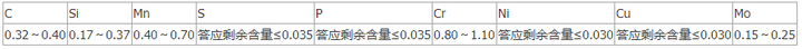 35CrMo合金结构钢履行标准:GB/3077-1999对应标准:JIS G4053:2003;热处理标准:淬火850℃,油冷;回火550℃,水冷、油冷。
