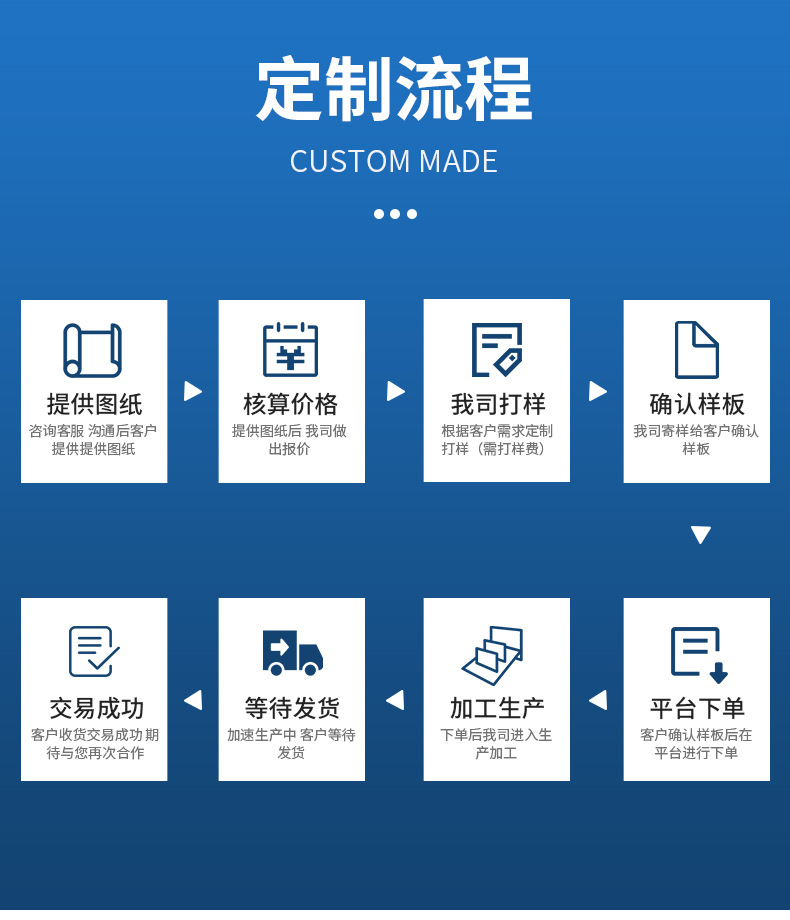 客户提供设计稿,我司确认文件OK,客户支付打样费,我司安排打样并寄出样品,客户确认样品OK, 签定大货生产合同,客户付30%定金,我司安排生产大货,大货OK(拍照或寄大货样客户确认或客户亲自验货),客户付清余款,我司安排发货
