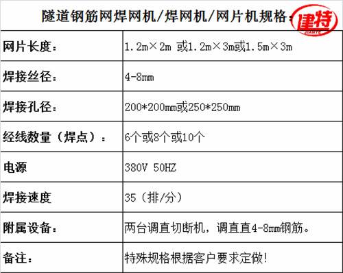 建特——隧道钢筋网焊网机/网片机电动机动力,采用同步控制技术,分控焊接与焊接时间均由数字编程系统控制,输入面板为触摸屏或按键两种,操作更加智能化、合理化,并且具有一次压紧,分次焊接的特点,焊接动力为电动,采用步进电机料斗,制动电机驱动小车送经,步进电机驱动小车拉网。经丝与纬丝均由校直机校直切断,竖丝人工摆放,横丝自动落丝。