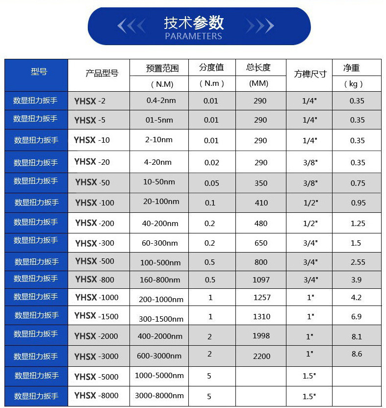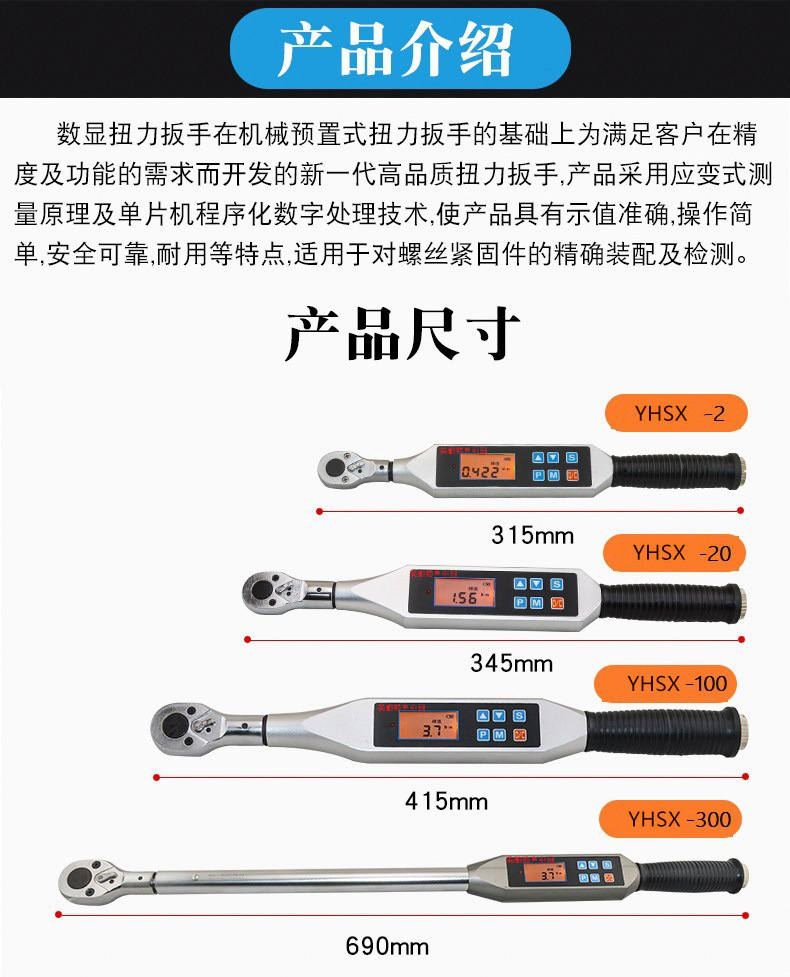 四川远跃恒生产销售的YHSX系列数显扭力扳手是一款高智能用于预紧和检测使用的语音式、三色变光液晶屏(黄、绿、红)实现功能的数字显示的扭矩工具,将德国先进扭矩控制技术和人性化理念的新款产品,产品精度高,操作简单,为紧固件的扭矩控制提供了可靠的保证。