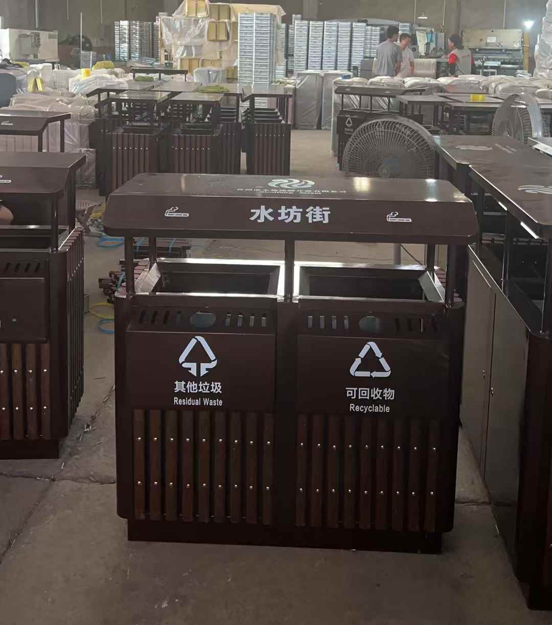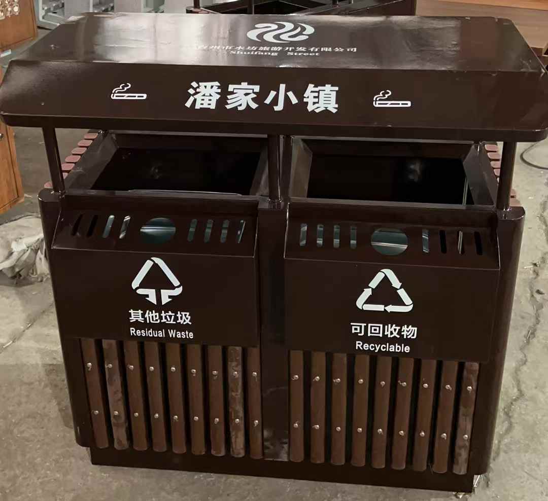 这款垃圾桶采用双桶分类设计,外观以深棕色为主色调,搭配木质条状元素,颇具质感与自然风格。左右两侧分别明确标识“其他垃圾”和“可回收物”,并配有国际通用回收标志,上方设有投放口,方便垃圾投放,整体既实用又能很好地融外环境 。外观独特:深棕配色搭配木质条,自然美观,适配多种户外场景。分类明确:清晰标注“其他垃圾”和“可回收物”,便于投放。耐用性强:材质坚固,能抵御户外风吹日晒,使用寿命长 。投放便利:开口设计合理,方便垃圾轻松投入。