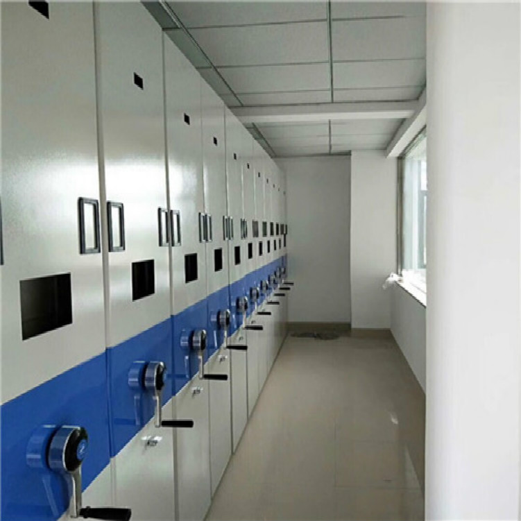 据库房特征进行合理布局,高度利用空间,采用多节多联安放在固定的轨道上形成一整体,用手摇或电动方式移动各列进行存取。