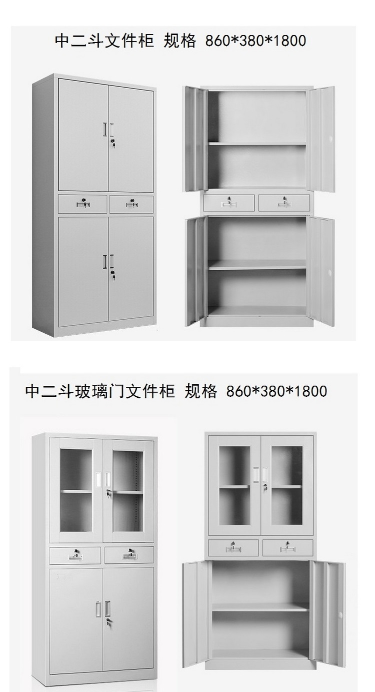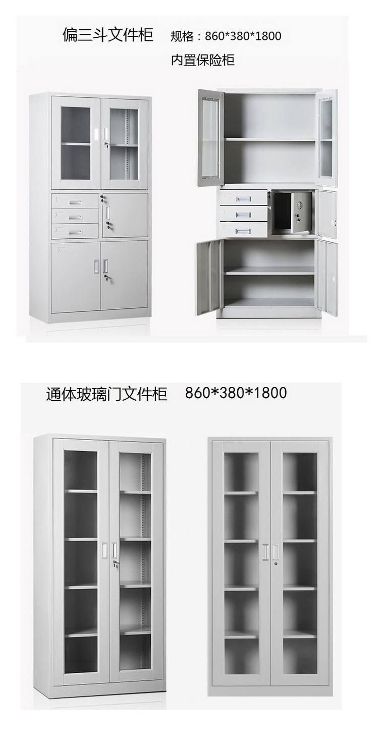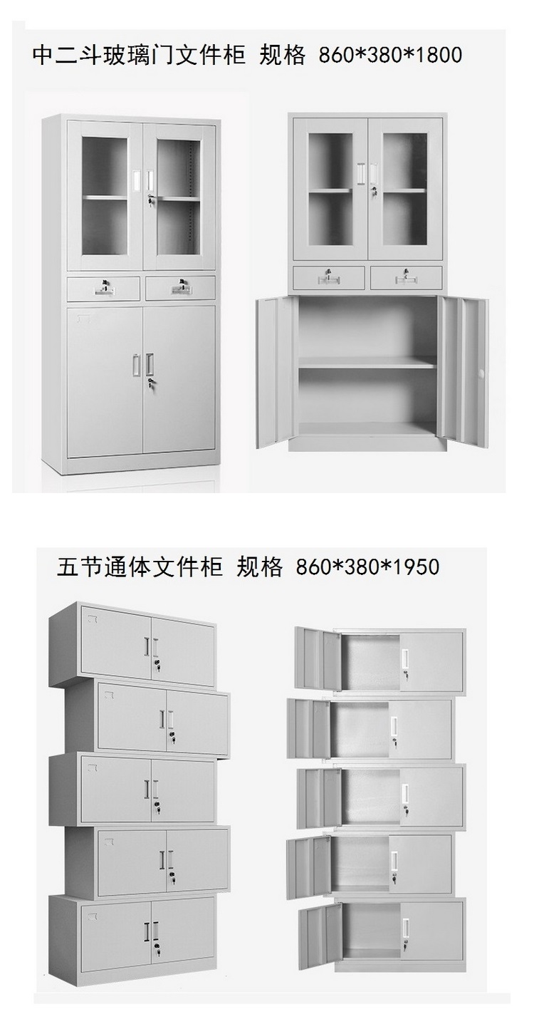金属文件柜种类繁多:中二斗文件柜、开门玻璃文件柜、中五斗宽移门玻璃文件柜、上下开门文件柜、偏三斗文件柜、二节开门文件柜、中二斗文件柜、中六斗开门文件柜、偏六斗开门玻璃文件柜、上开门玻璃下铁门文件柜、偏三斗玻璃文件柜、三门十斗文件柜、十二斗抽屉柜、五节文件柜、五节财务文件柜、二斗二节文件柜、中二斗六门文件柜、通体三节文件柜、三门六斗文件柜、偏三斗五门文件柜、玻璃对开门文件柜、四门文件柜、常规的文件柜尺寸:860*380*1800mm,一般五节档案柜尺寸:860*380*1950,柜体、柜门制作技艺优良,可保证开合顺滑,流畅;柜内层板可按自身要求自由调节高度 ,其外部造型细腻流畅。内部结构精密坚实等。 而两节档案柜,尺寸一般上节高850*宽860*深380MM,下节高950*宽860*深380MM,其材质常为冷轧钢板,耐压强度大,抗冲击不易变形,冷轧板表面处理方式:整体柜体→酸洗→清洗→中和→去油→清洗→表调→清洗→磷化→清洗→钝化→喷塑烘烤→柜体成型,柜体表层静电喷塑、防锈处理。