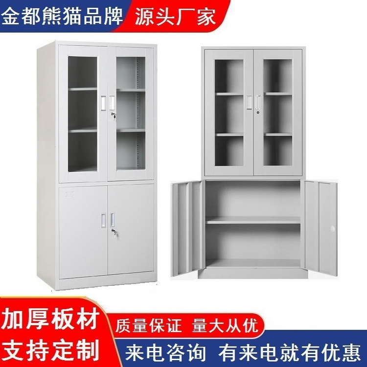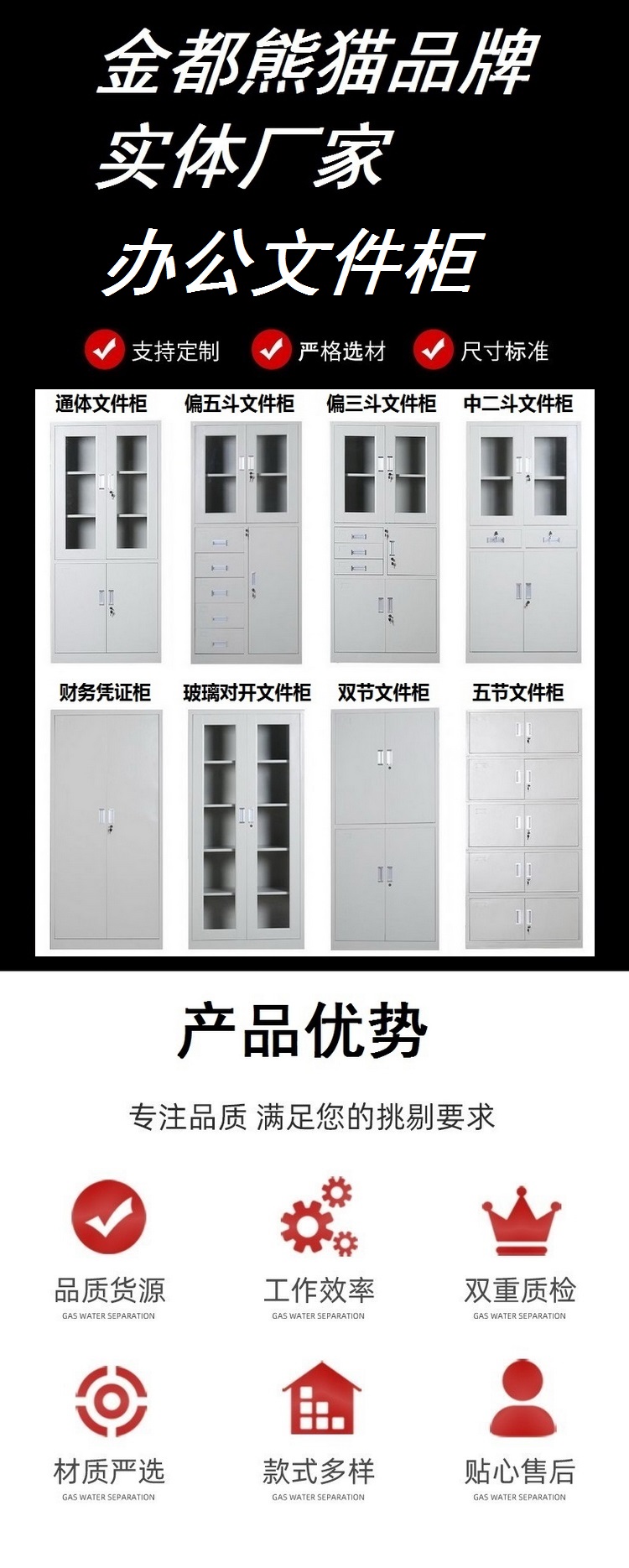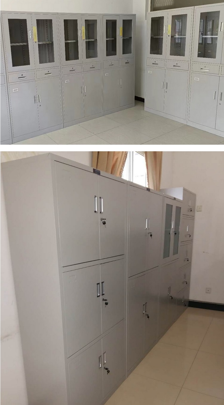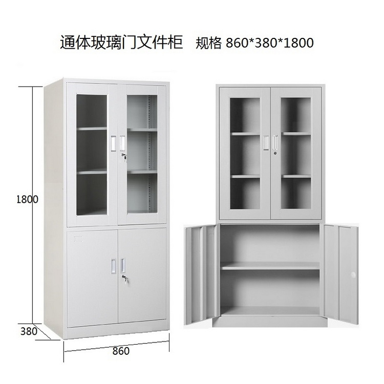 金属文件柜种类繁多:中二斗文件柜、开门玻璃文件柜、中五斗宽移门玻璃文件柜、上下开门文件柜、偏三斗文件柜、二节开门文件柜、中二斗文件柜、中六斗开门文件柜、偏六斗开门玻璃文件柜、上开门玻璃下铁门文件柜、偏三斗玻璃文件柜、三门十斗文件柜、十二斗抽屉柜、五节文件柜、五节财务文件柜、二斗二节文件柜、中二斗六门文件柜、通体三节文件柜、三门六斗文件柜、偏三斗五门文件柜、玻璃对开门文件柜、四门文件柜、常规的文件柜尺寸:860*380*1800mm,一般五节档案柜尺寸:860*380*1950,柜体、柜门制作技艺优良,可保证开合顺滑,流畅;柜内层板可按自身要求自由调节高度 ,其外部造型细腻流畅。内部结构精密坚实等。 而两节档案柜,尺寸一般上节高850*宽860*深380MM,下节高950*宽860*深380MM,其材质常为冷轧钢板,耐压强度大,抗冲击不易变形,冷轧板表面处理方式:整体柜体→酸洗→清洗→中和→去油→清洗→表调→清洗→磷化→清洗→钝化→喷塑烘烤→柜体成型,柜体表层静电喷塑、防锈处理。