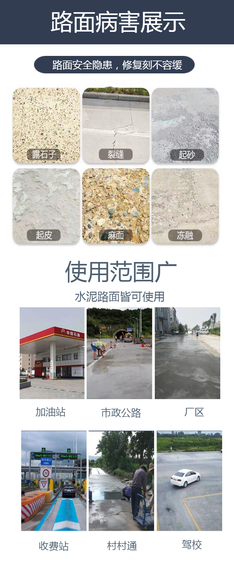 主要应用于:水泥混凝土路面的蜂窝、麻面、起皮、起砂、冻融盐蚀、露骨、微细裂纹等表层病害