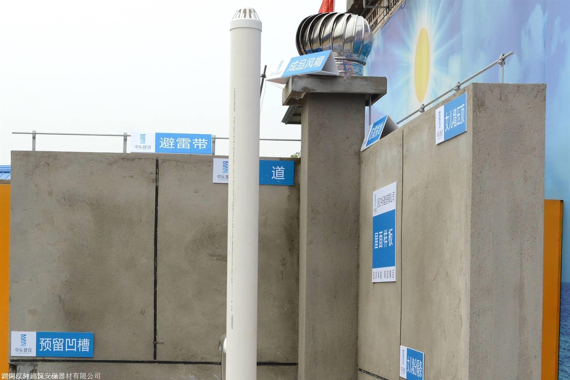 质量样板展示区-屋面样板展示:砖混、水泥砂浆找坡,水泥砂浆找平,圆角,基层处理,防水,保温 ,隔离层、烟道、风帽、避雷接地、排气、透气等工艺。