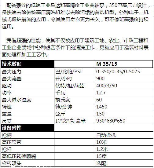 配备低速工业马达和高精度工业曲轴泵,350巴高压力设计,是快速去除传统高压清洗机难以去除污垢的机型。各种电子、机械式保护措施的应用,令其使用寿命久,可不停班高强度持续运用。凭借强的性能,使其不仅被应用于建筑工地、农业、市政工程和工业企业领域中各种艰苦条件下的清洗工作,更被应用于建筑材料表面处理和加工工艺中。