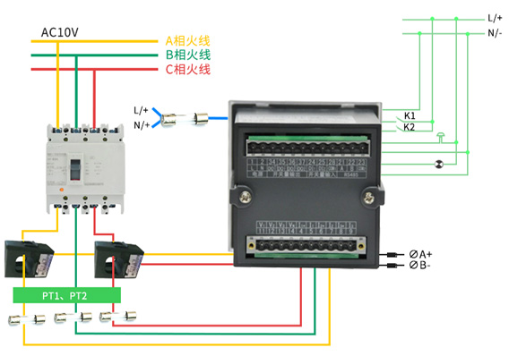 4、ACR330ELH在选配K功能时具备1路有功电能脉冲信号输出端口;