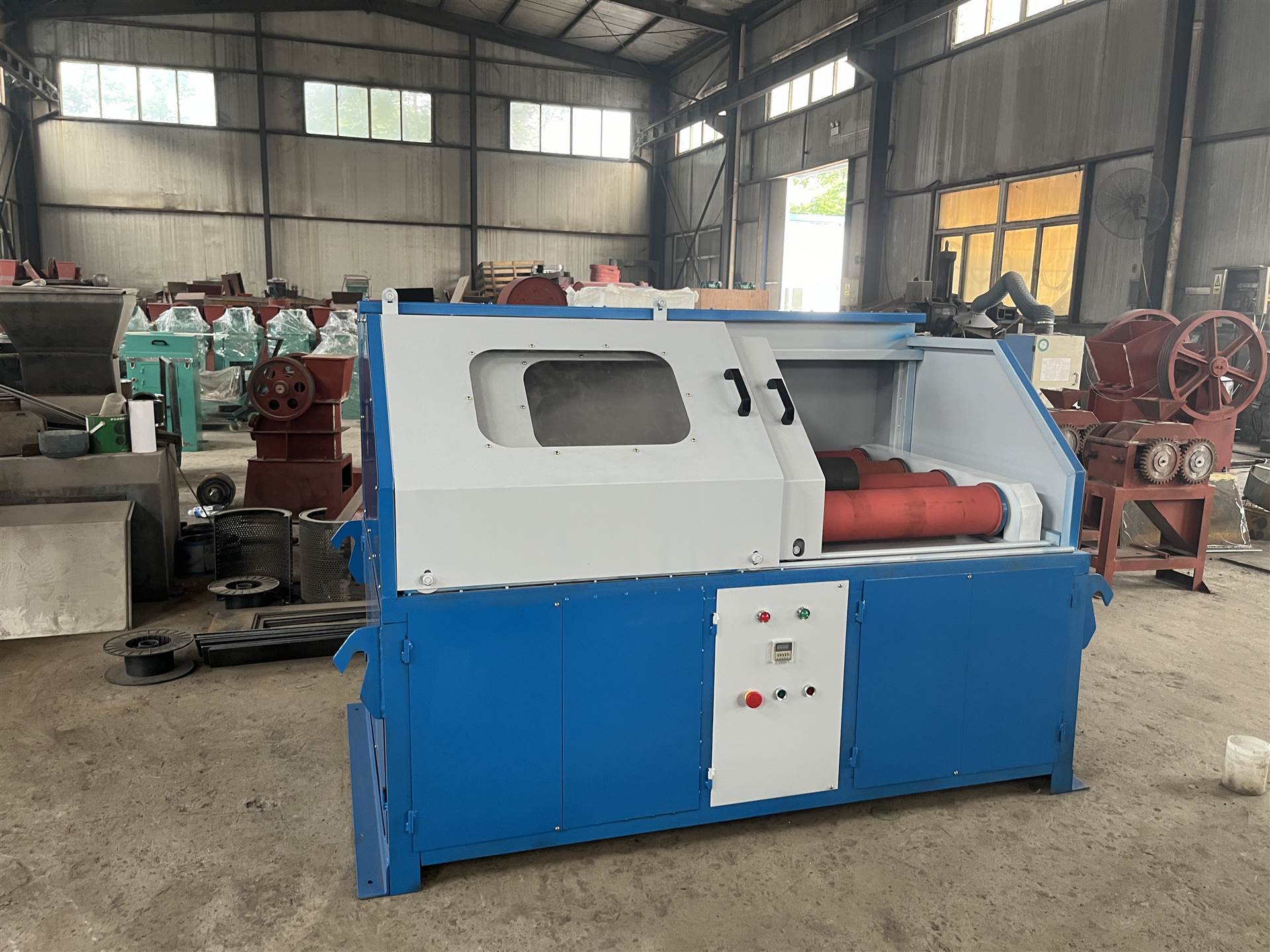 机器的工作方式为滚筒研磨式。机器由电动机驱动,在电动机旋转带动下,驱动滚筒托辊旋转,带动滚筒转动。滚筒内装有钢棒和矿石物料,滚筒转动时,装在滚筒内的钢棒撞击矿石物料,同时物料之间、物料与滚筒壁也产生碰撞、研磨、摩擦等运动,使物料研磨成粉状,达到制粉效果。