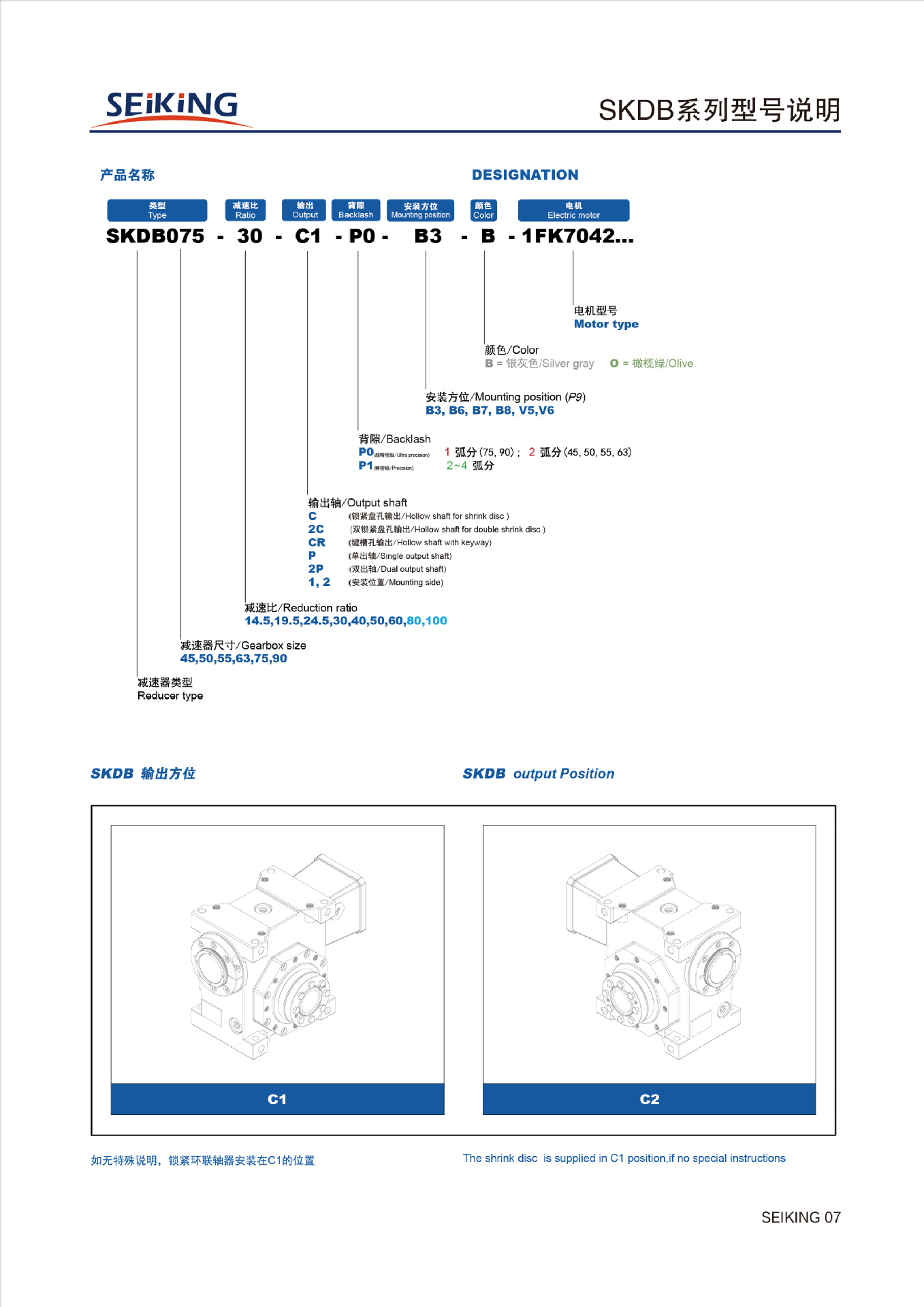 1、SKDB双导程蜗轮蜗杆伺服减速机有SKDB45、SKDB50、SKDB55、SKDB63、SKDB75、SKDB90六种规格,速比有14.5、19.5、24.5、30、40、50、60、80、100九种规格,采用双导程蜗杆传动;