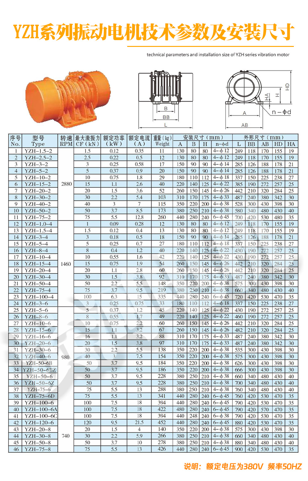 额定功率:范围从0.37千瓦到1.1千瓦不等,如YZH-5-2三相振动电机额定功率为0.37千瓦,YZH-15-2卧式振动电机额定功率为1.1千瓦。