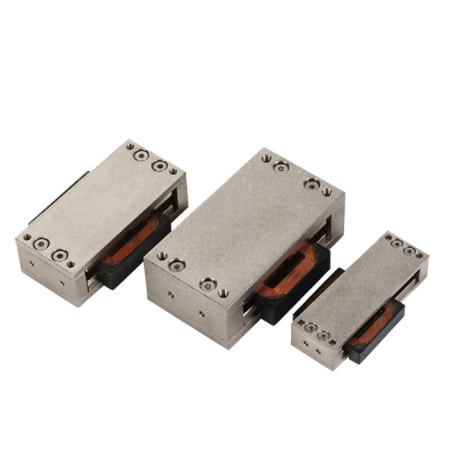 平板型音圈电机,线圈中的电流与永磁体相互作用产生推力,实现直线运动,可用于两点控制、伺服控制和力控制。