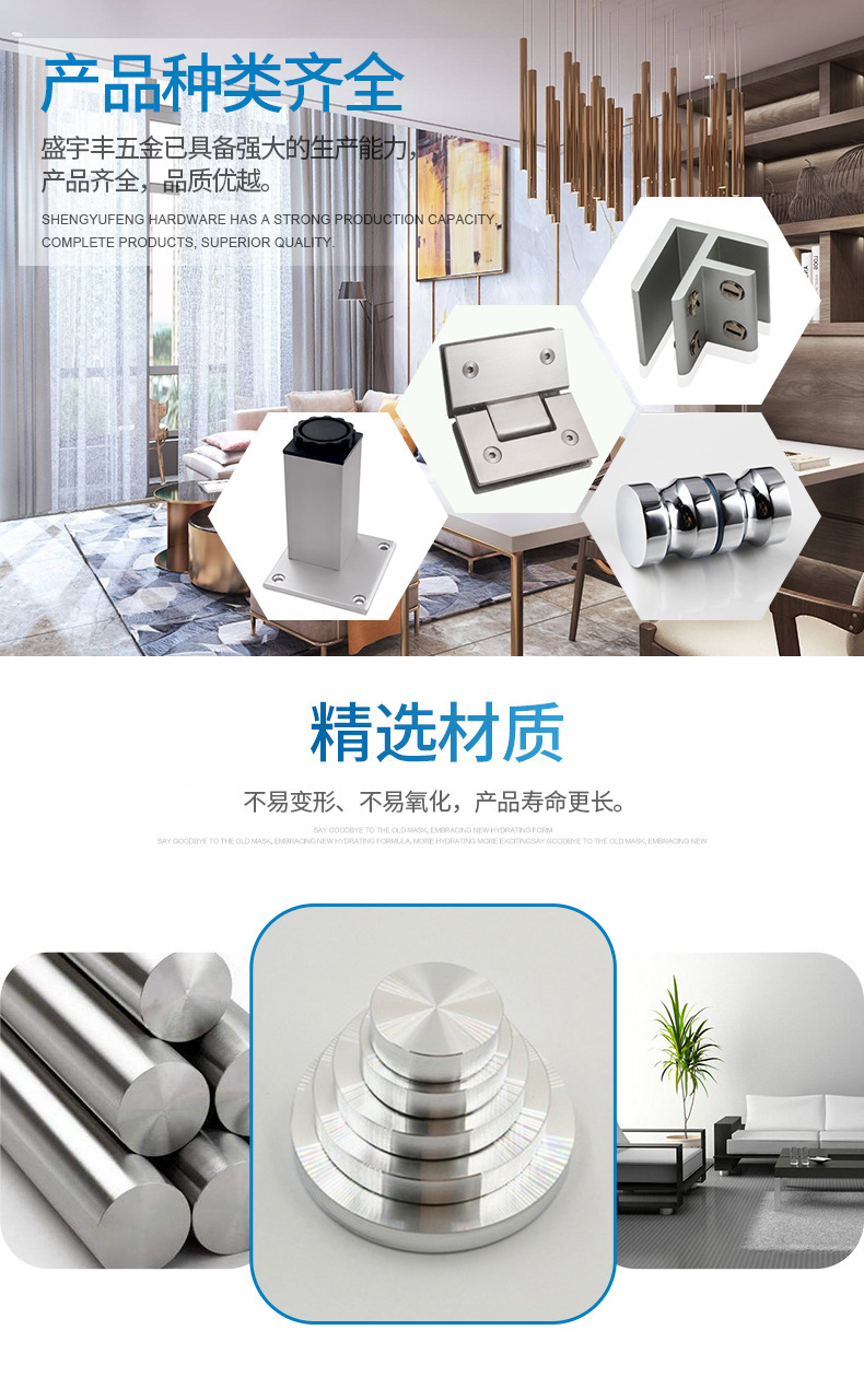 高要市金利镇盛宇丰五金制品厂主要经营是家具五金,玻璃配件,卫浴配件,广告螺丝,浴室拉手,家具柜脚。盛宇丰五金是一家生产工程配件五金等产品的制造商。拥有先进、快速、严谨的管理模式,精良的生产设备,优良的技术力量,确保了我们能准时生产制造出优良的产品;高素质的商务队伍,完善的营销网络,确保了我们为客户提供优良的售前、售后服务。 在管理方面,全面执行规范化的质量管理标准,务求使产品达到“方便、实用、高品质”的要求,确立了“产品化、生产规模化”的经营方针。经过了多年的不懈努力,盛宇丰五金已具备强大的生产能力,产品齐全,品质优越。