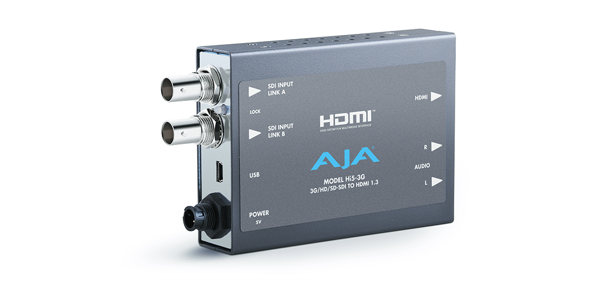 Hi5-3G将3G-SDI、双路或单路HD-SDI、SD-SDI转换为HDMI v1.3a,用于HDMI监视器。每像素30-bit的HDMI v1.3a功能可完全支持10-bit的监视器。HDMI输出中支持音频,便于单线音频/视频连接。Hi5-3G提供2通道RCA式音频输出,在需要时单独进行音频监测。USB连接可轻松进行PC/Mac设置和现场升级。