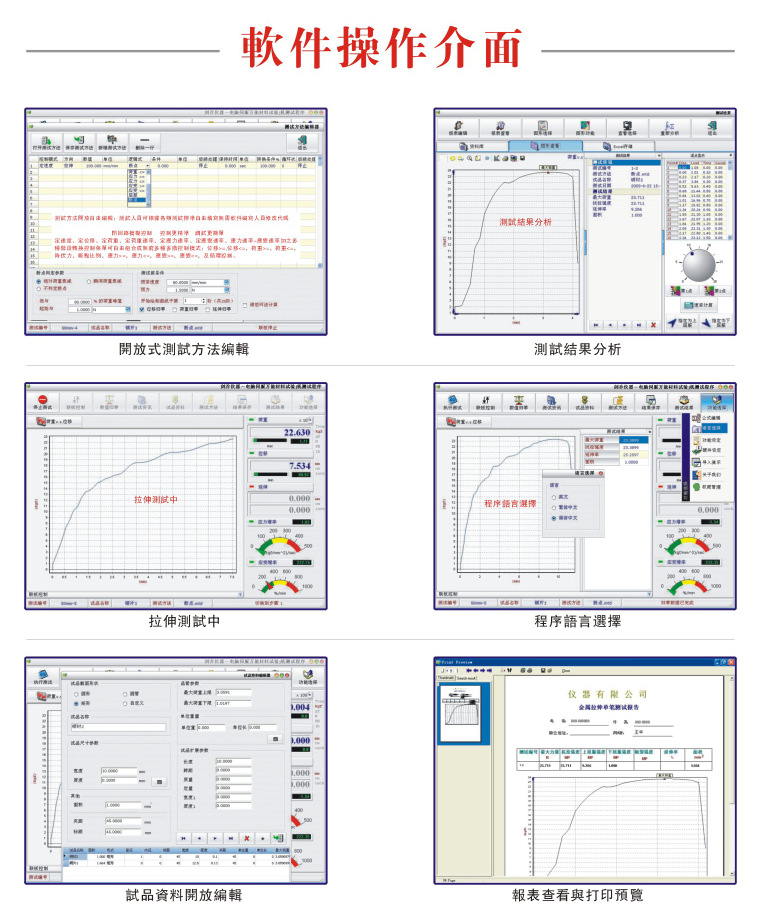 1.测试模式多样:普通、拉伸方、拉伸圆、撕裂、剥离、帘线、帆布、定载荷、定位移、弹簧、三点抗弯、四点抗弯