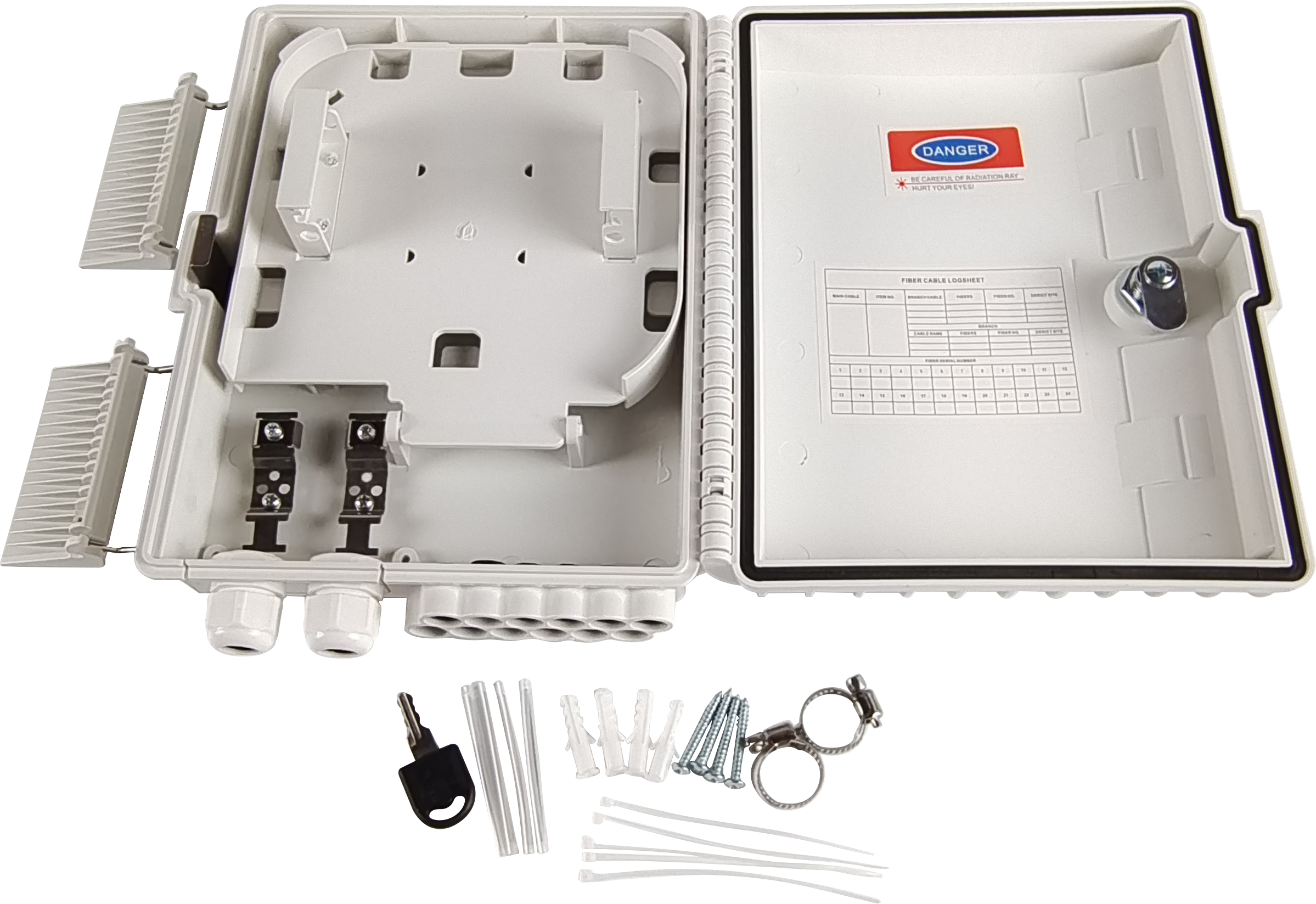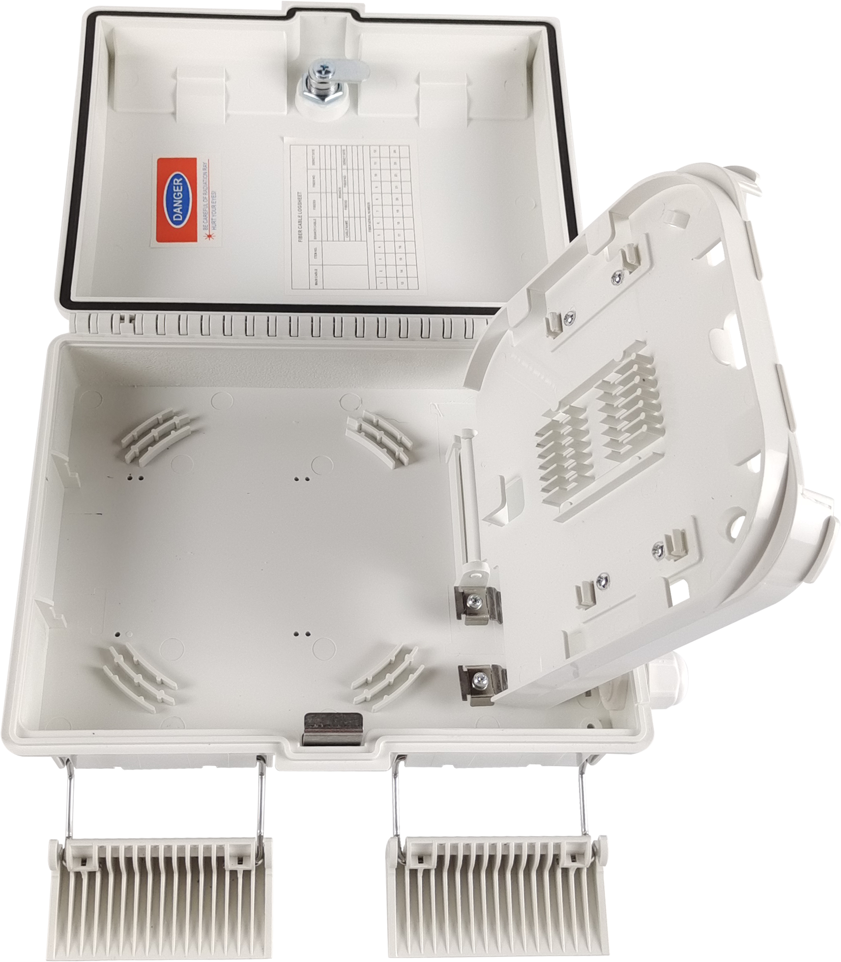 该设备用于FTTx通信网络系统中,作为馈线电缆与丢线电缆连接的终端。光纤的拼接、分束、分配都可以在这个盒子里完成,同时为FTTx网络的建设提供了坚实的保护和管理;