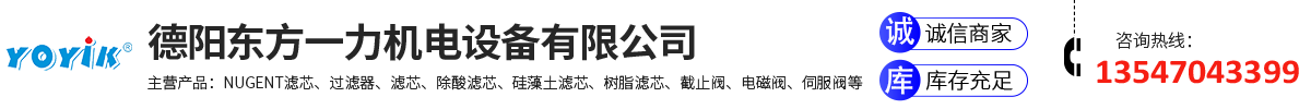 东方一力-YOYIK公司简介 我公司位于中国重型装备基地四川德阳,创立于2004年。距离三星堆古遗址博物馆仅26公里。主要生产经营:电站主辅机零部件、电站主辅机控制系统零部件、液压元件、气动元件、过滤器、滤芯、EH系统配件、直流加热柜、螺栓加热棒、绝缘材料、密封胶、巴氏合金轴瓦、直流电机/交流电机配件、电机修理。东方一力机电设备有限公司是美国W.M. NUGENT & CO,INC授权的中国代理商,销售NUGENT滤芯和过滤系统产品。东方一力为众多汽轮发电主机配套商及电厂等工业用户提供了大量的原装进口的NUGENT硅藻土滤芯等产品。公司在很多液压产品的价格和货期均有较大优势,包括泵、阀、密封材料等。