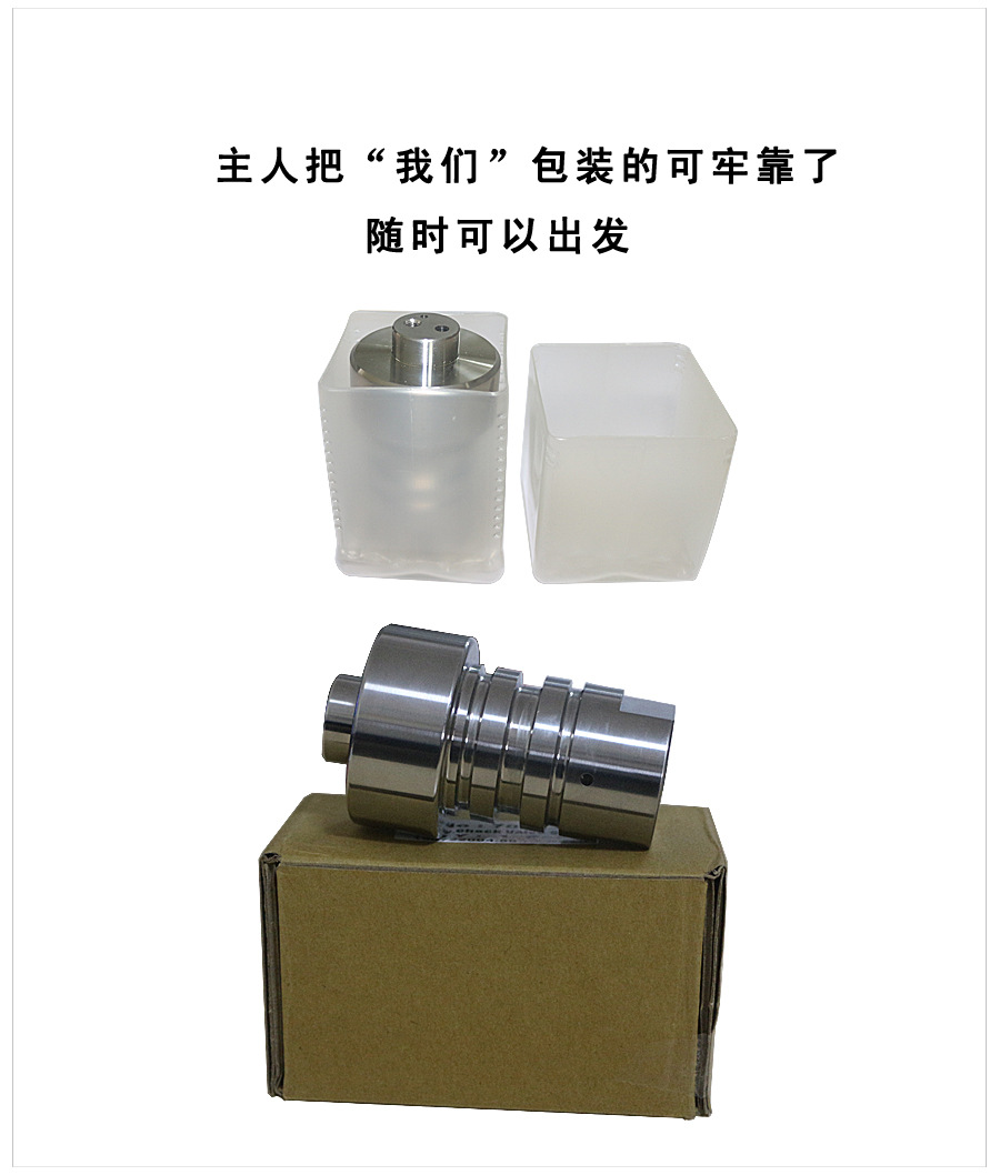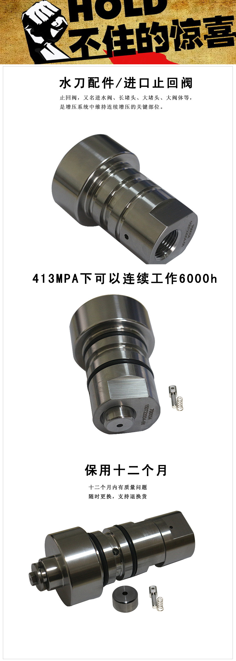 止回阀又叫进水阀、堵头、单向阀、长堵头等。在产生连续高压水的过程中发挥着关键作用。每台增压器上都有两个止回阀,它们分别被安装在增压器两端,通过高压缸端盖使得止回阀与高压缸一侧紧密挨在一起。当活塞运动到左边时,右边的低压水则通过止回阀进水孔流入高压缸内,当活塞往右边运动时,处在右边的陶瓷活塞杆开始挤压右边高压缸内的水,使其被迫从右边止回阀细小的出水孔流出,从而产生一定压力的水,即高压水。活塞左右来回运动,高压水左右交替流出,连续的高压水就这样产生了。