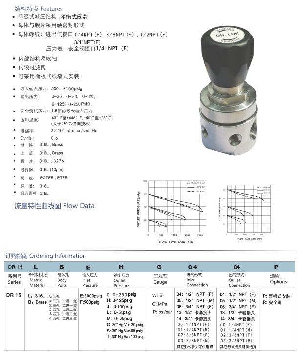 DR15不锈钢减压阀,单级式膜片减压结构,不锈钢膜片压力传输,输出压力稳定,主要应用于中等流量气体系统,适用于纯净气体,标准气体,腐蚀性气体,液体等。