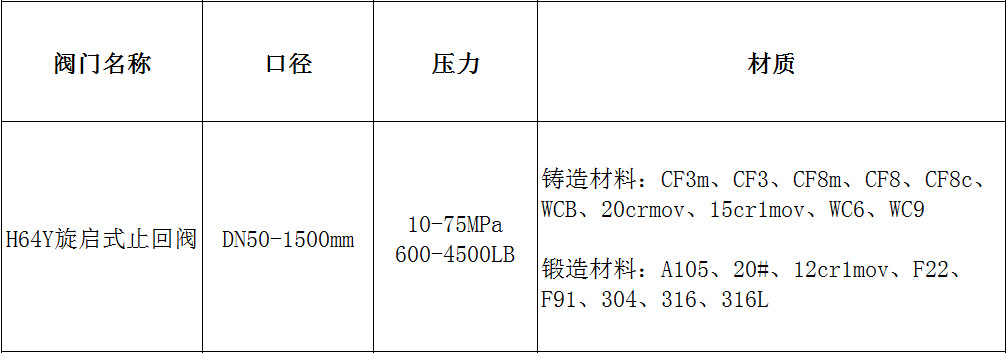 旋启式止回阀是能自动阻止流体倒流的阀门。它的阀瓣在流体压力作用下自动开启,流体从进口侧流向出口侧;当进口侧压力低于出口侧压力时,阀瓣在流体压差与自重等因素作用下自动关闭,以防流体倒流。广泛应用在冶金、电站、炼油厂和石化厂等管路系统。