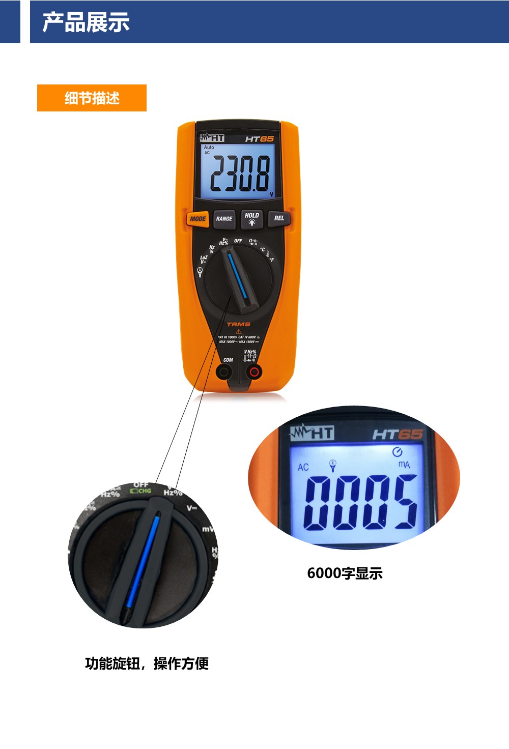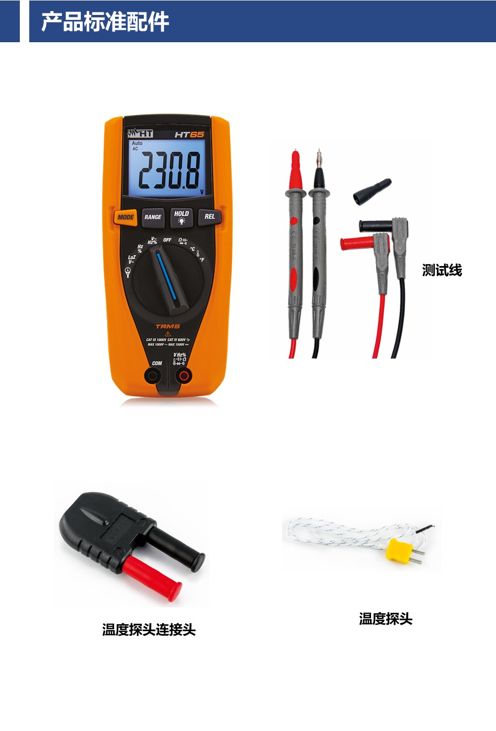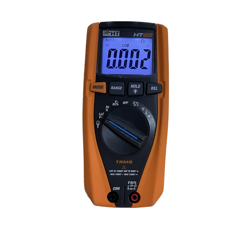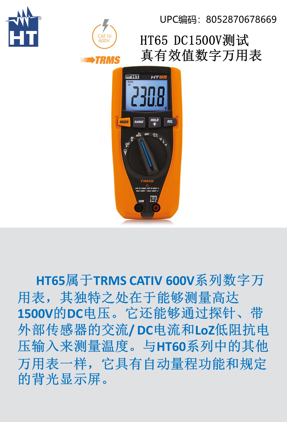 HT65属于TRMS CATIV 600V系列数字万用表,能够测量高达1500V的DC电压。它还能够通过探针、带外部传感器的交流/ DC电流和LoZ低阻抗电压输入来测量温度。与HT60系列中的其他万用表一样,它具有自动量程功能和规定的背光显示屏。