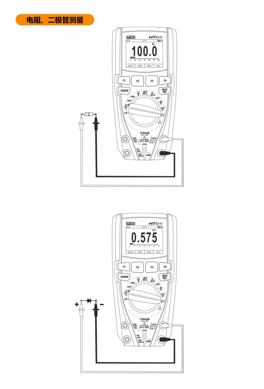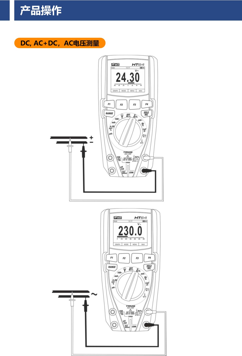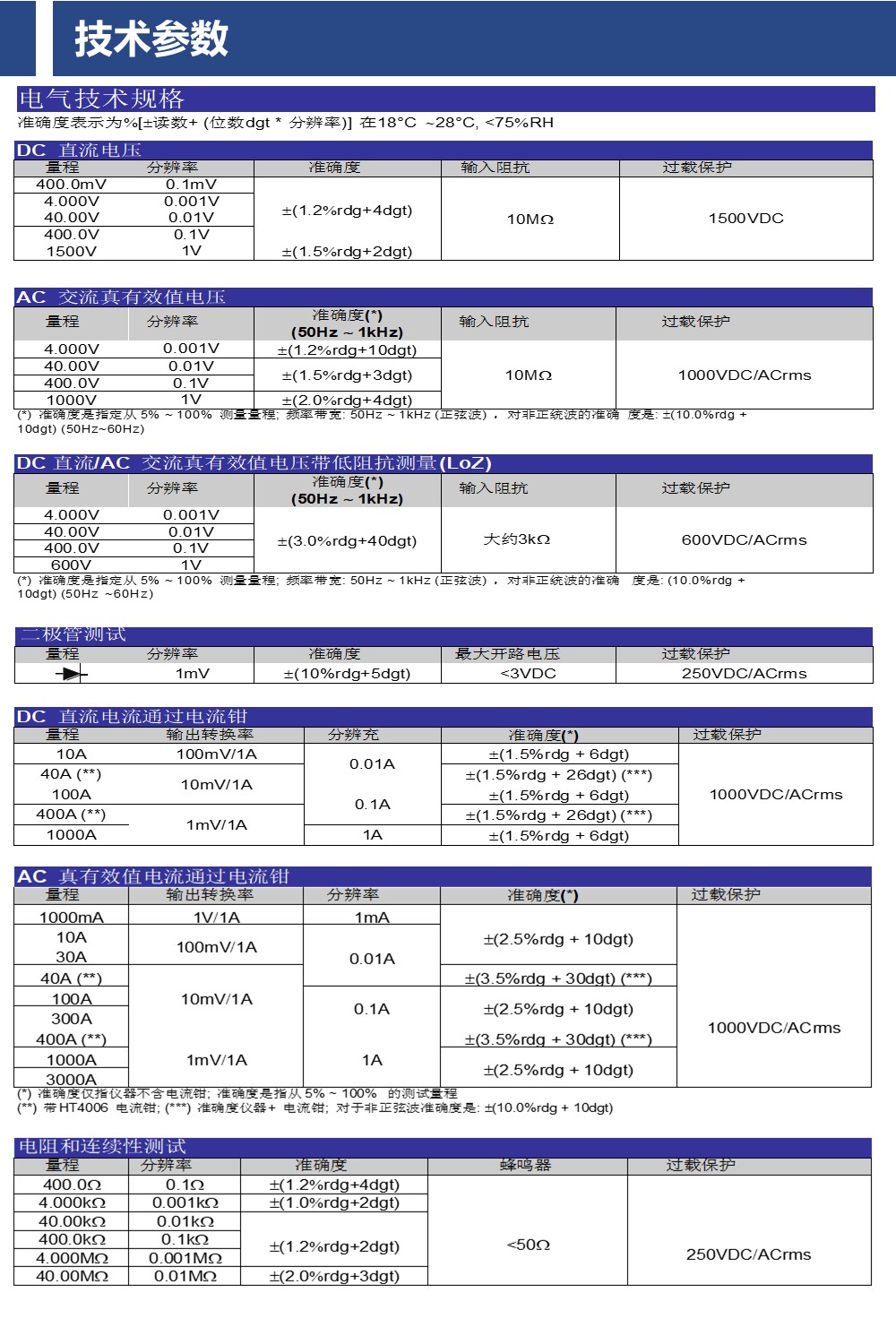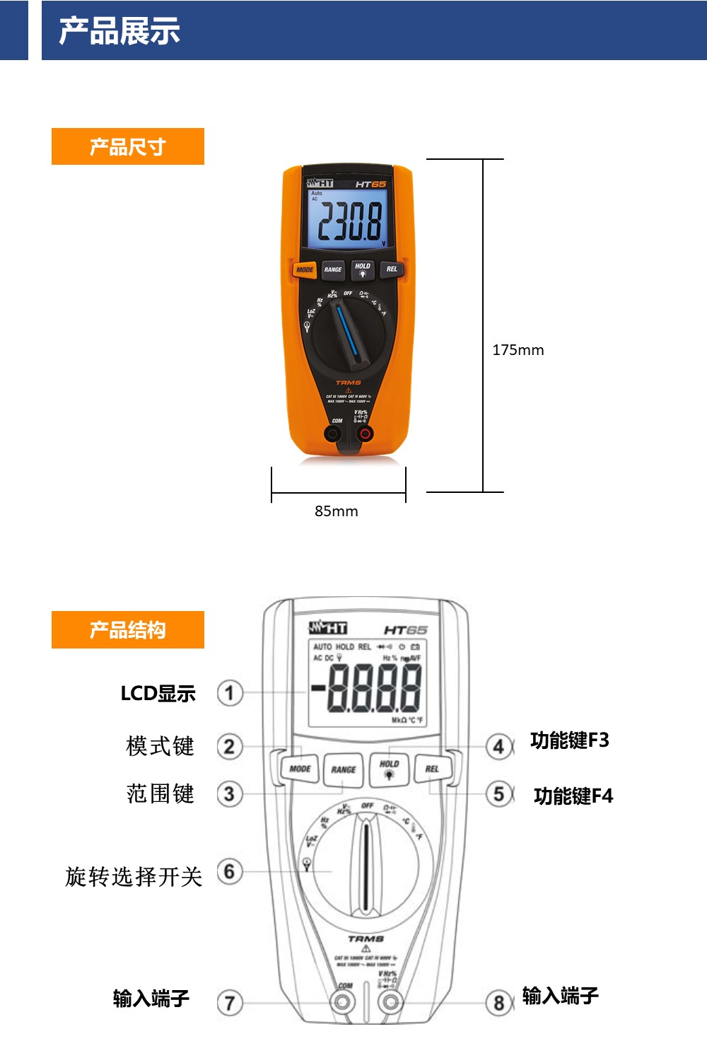 HT65属于TRMS CATIV 600V系列数字万用表,能够测量高达1500V的DC电压。它还能够通过探针、带外部传感器的交流/ DC电流和LoZ低阻抗电压输入来测量温度。与HT60系列中的其他万用表一样,它具有自动量程功能和规定的背光显示屏。