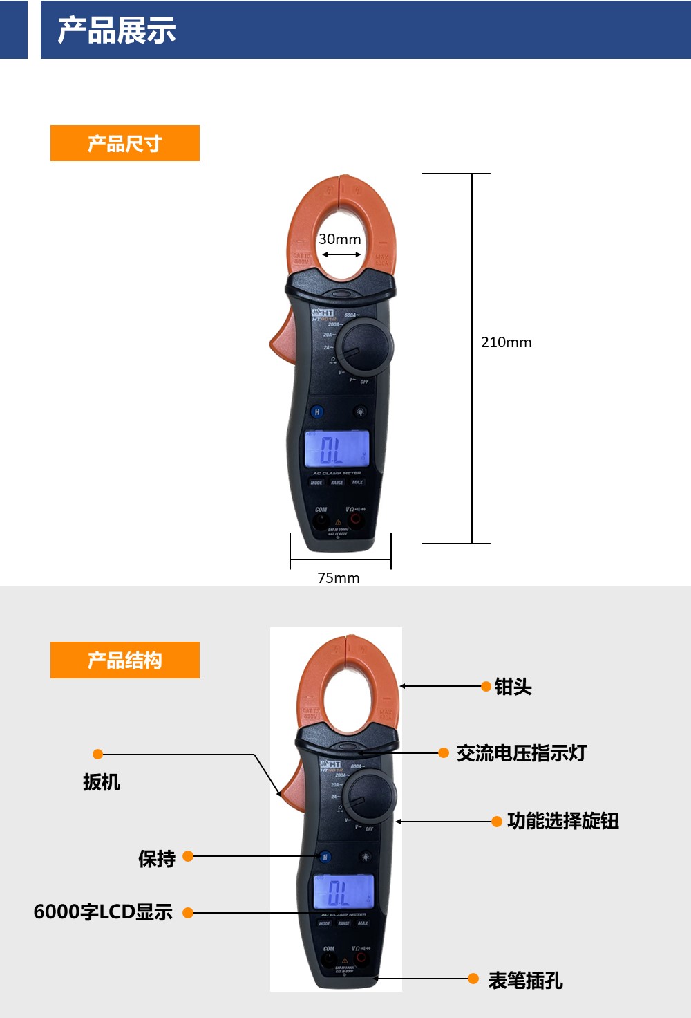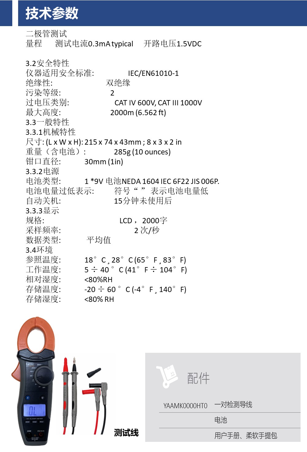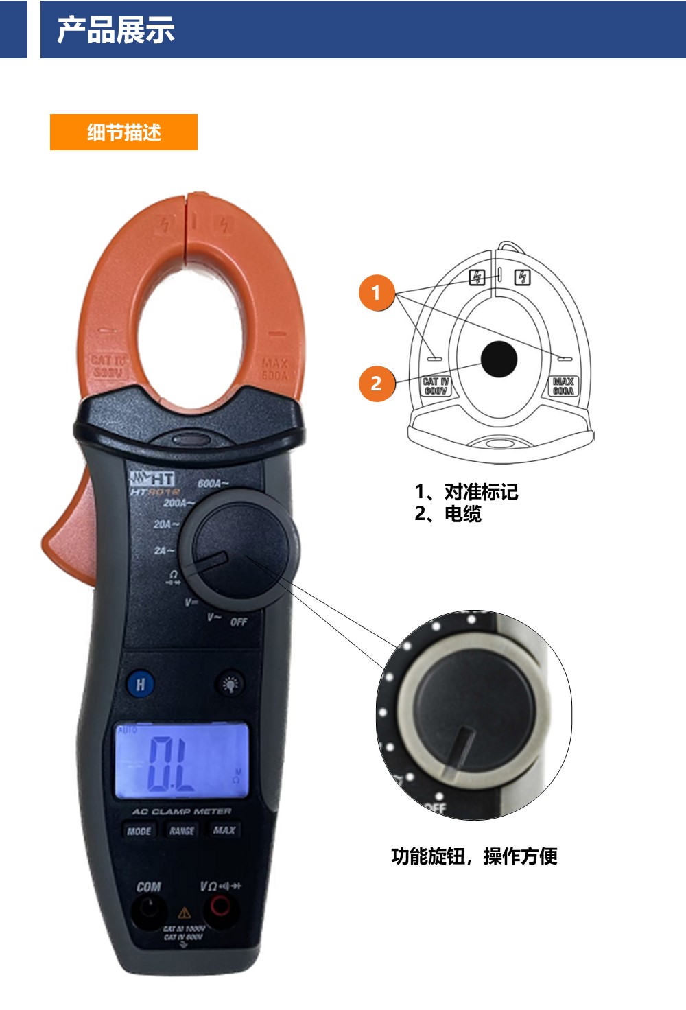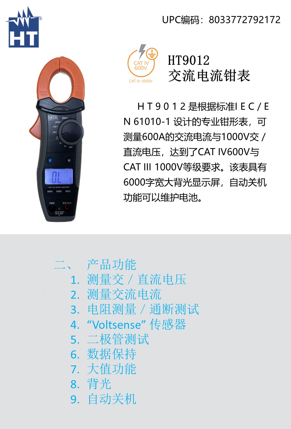 HT9012是用于测量交流电流的钳形电流表,AC电流测试达到600A,AC/DC电压测试达到600V,测量类别达到CATIV600V。HT9012达到2000字显示,并有背光显示,方便在黑暗环境操作。是一款遵照IEC/EN61010-01标准而设计的钳形电流表。该表具有6000字宽大背光显示屏,自动关机功能可以维护电池。