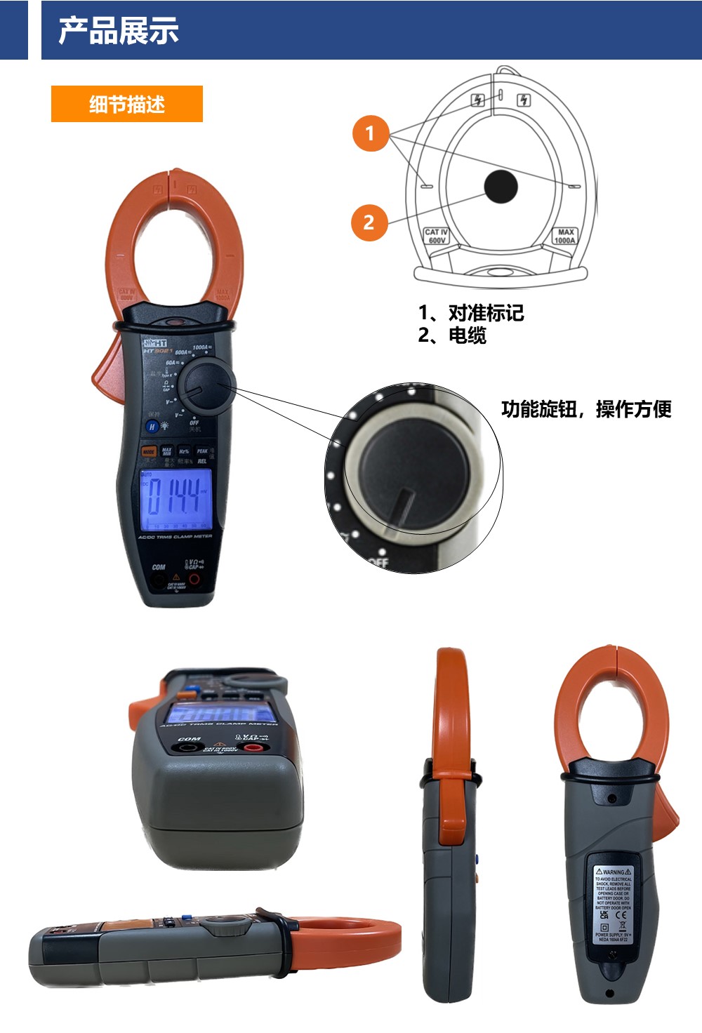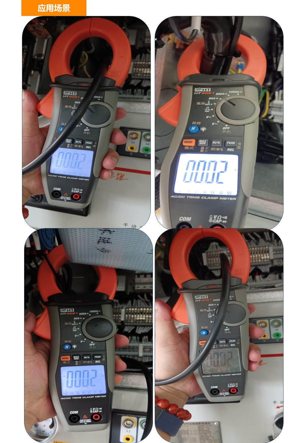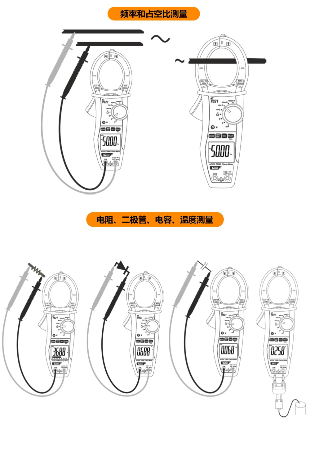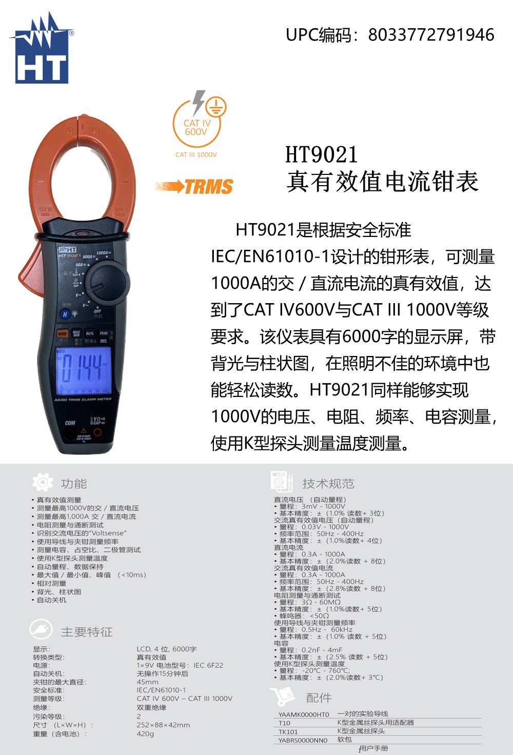 HT9021是用于测量交直流真有效值的钳形万用表,AC/DC电流测试达到1000A,AC/DC电压测试达到1000V,测量类别达到CATIV600V。HT9021达到6000字显示,并有背光和模拟指针显示。是一款遵照IEC/EN61010-01标准而设计的钳形电流表。该仪器具有6000字的显示屏,带背光与柱状图,在照明不佳的环境中也能轻松读数。