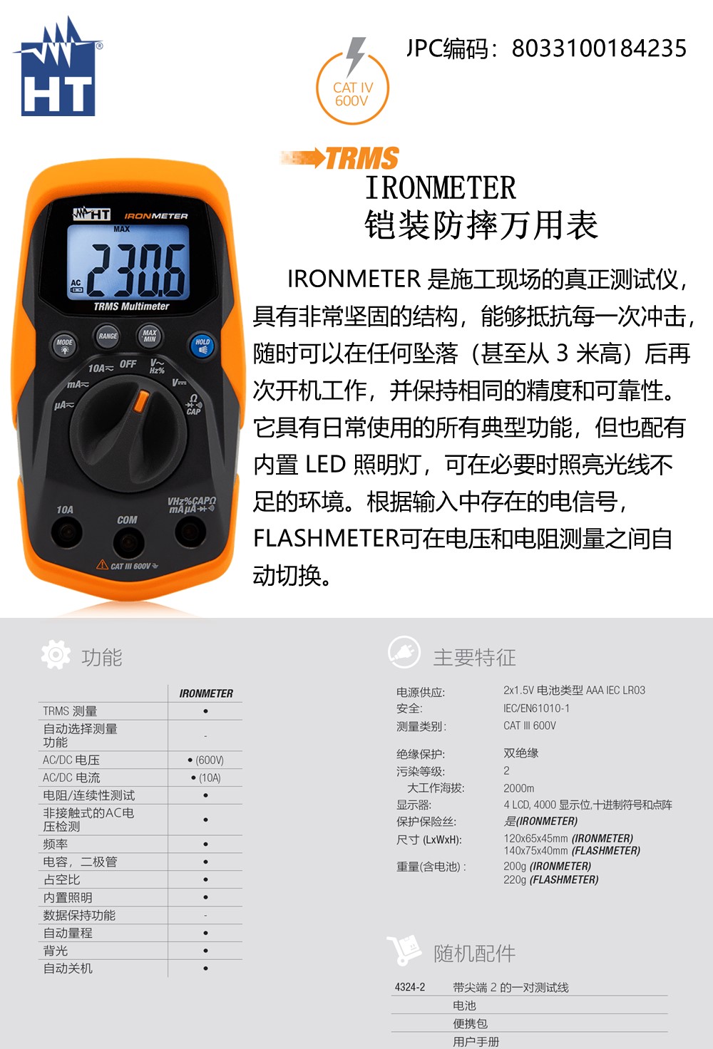 IRONMETER是施工现场的真正测试仪,具有非常坚固的结构,能够抵抗每一次冲击,随时可以在任何坠落(甚至从3 米高)后再次开机工作,并保持相同的精度和可靠性。它具有日常使用的所有典型功能,但也配有内置LED 照明灯,可在必要时照亮光线不足的环境。根据输入中存在的电信号,FLASHMETER可在电压和电阻测量之间自动切换。