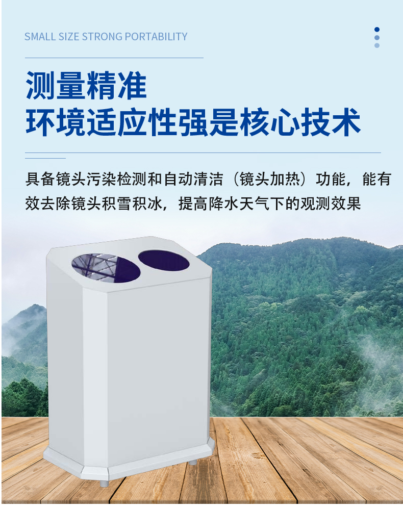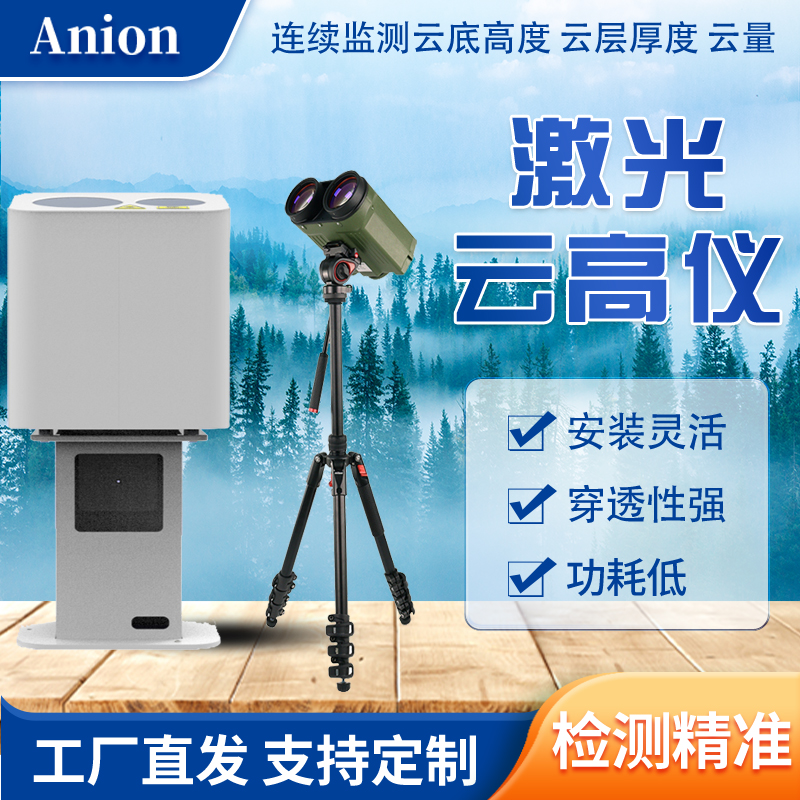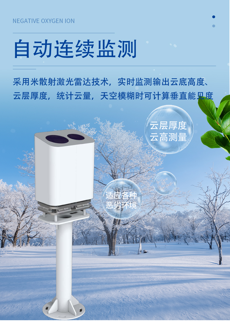 该产品利用米散射激光雷达技术,以特定频率主动地竖直发射红外脉冲激光,并以固定时间间隔探测大气的后向散射信号,获得随高度分布的回波廓线,通过信号处理和算法分析识别云层,计算输出云底高度、云层厚度,统计云量,天空模糊时可计算垂直能见度。数据产品丰富,结构简单,工作稳定,可靠性高,能耗低,安装维护方便。
