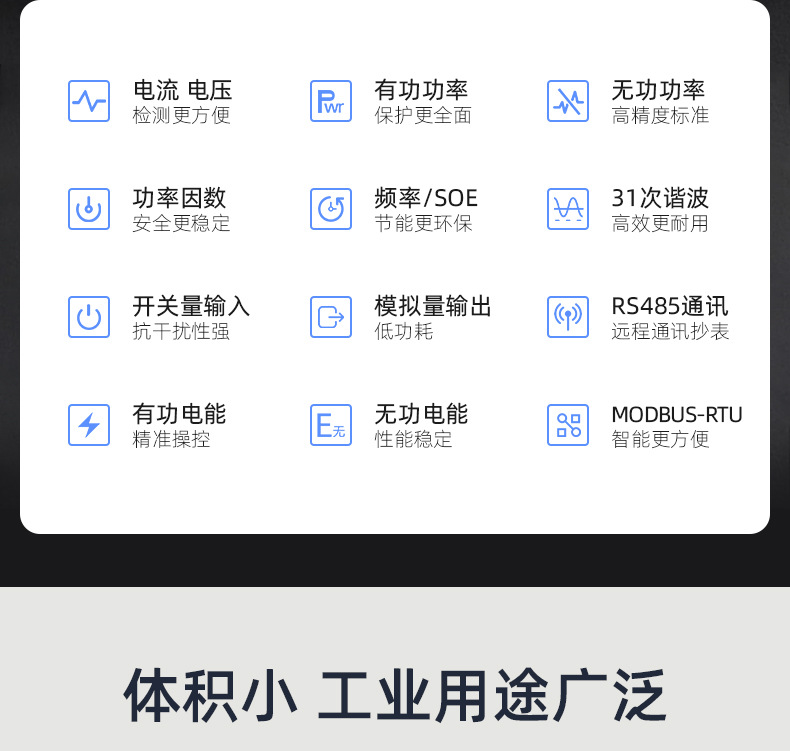2精度RMS测量,精度等级0.5电流额定值AC1A、5A过负荷持续:1.2倍瞬时:2倍/10s功耗<0.2VA(每相)阻抗<20MΩ精度RMS测量,精度等级0.5频率40~60Hz,精度0.1Hz功率有功、无功、视在功率,精度0.5级电能有功/无功电能计量,有功精度0.5级,无功精度1% 显示可编程设置、切换、循环显示电源工作范围AC、DC 85~265V功耗≦2VA输出可编程数字接口RS-485、MODBUS-RTU协议脉冲输出2路电能脉冲输出,光耦隔离开关量输入4路开关量输入,干结点方式开关量输出4路开关量输出,继电器模拟量输出4(2)路模拟量输出,4-20mA/0-20mA环境工作环境-25~55°C储存环境-40~85°C