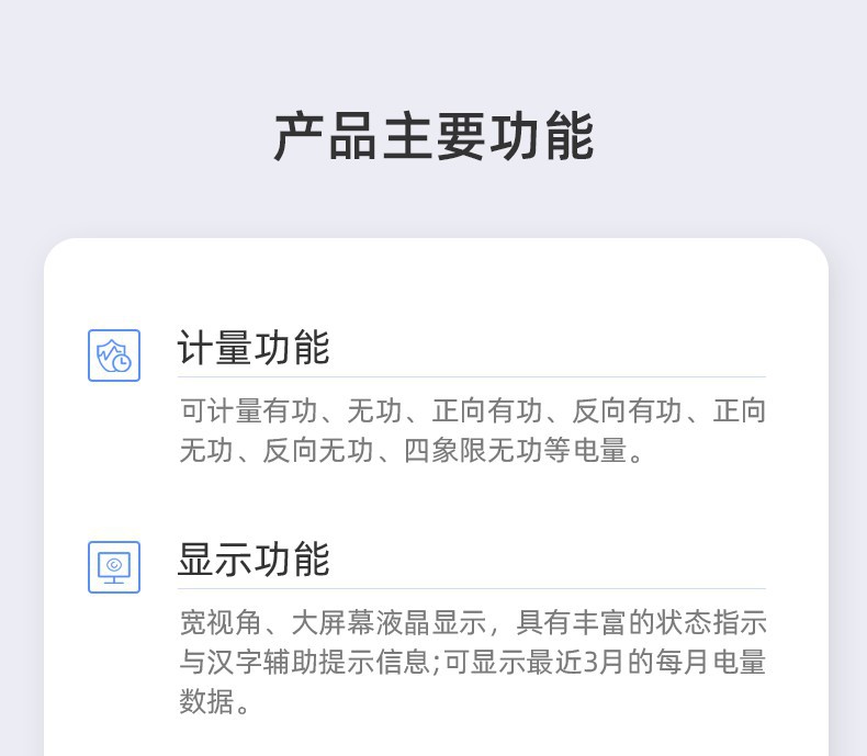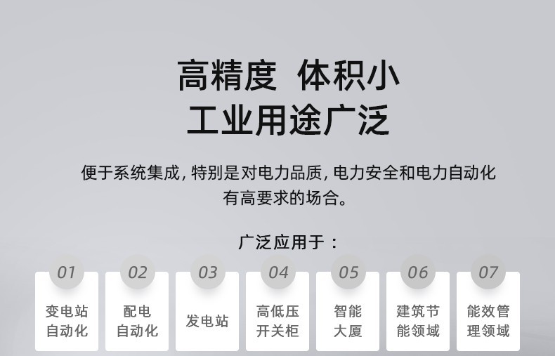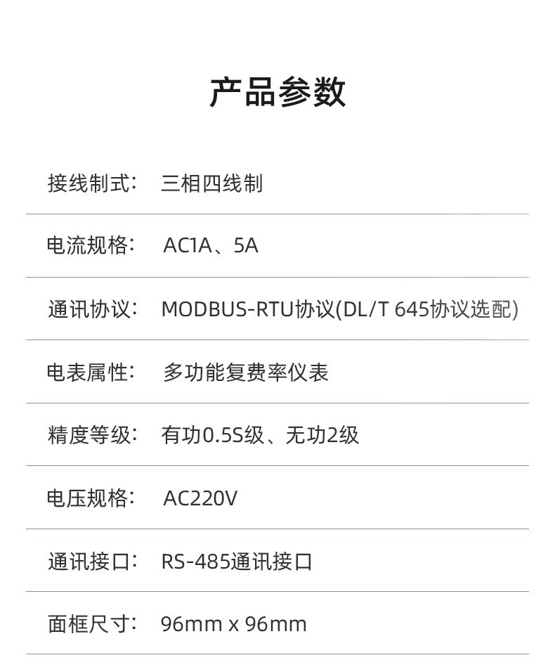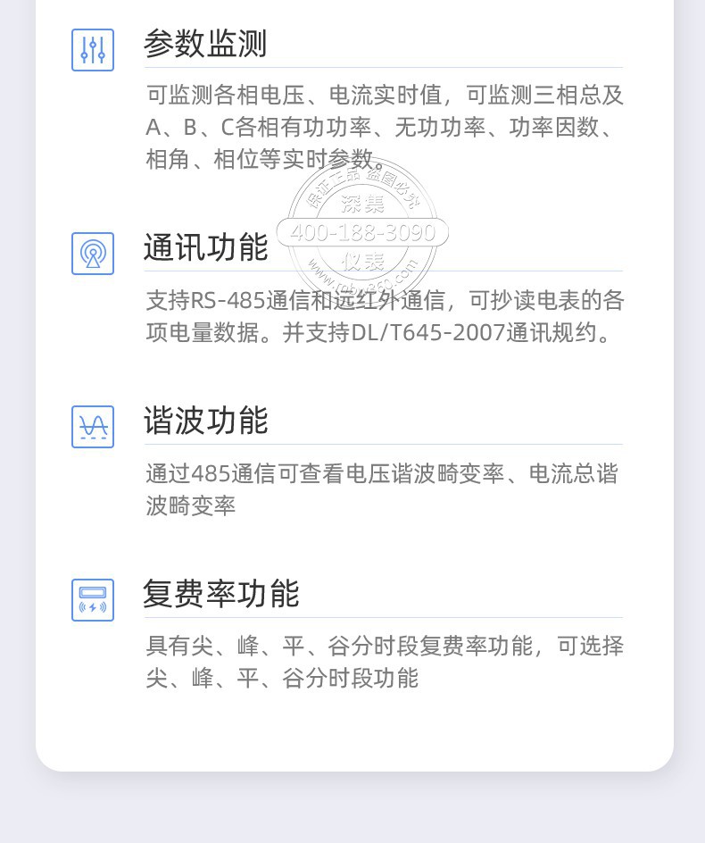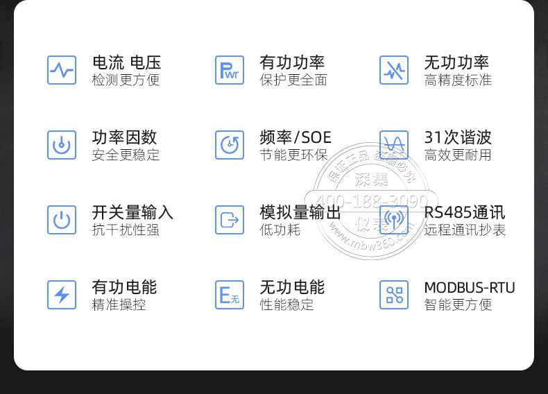 3、测量功能:总及A、B、C各相的电压、电流、视在功率、有功功率、无功功率、功率因数及电网频率;电压测量精度(50%~130%Un)1级;电流测量精度(1%In~Imax)1级;有功功率测量精度(1%In~Imax)1级;无功功率测量精度(1%In~Imax)2级。频率范围50±2.5Hz