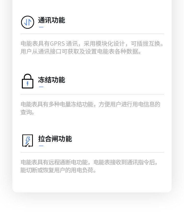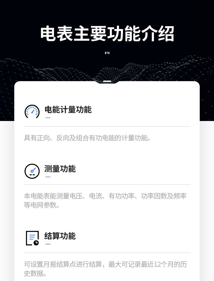 主要功能:电能计量、远程费控功能、显示功能、时钟时段及费率功能、校时、测量及监测、事件记录、冻结、停电抄表、数据存储、清零、通信、脉冲输出、负荷控制、参数设置、安全认证等。