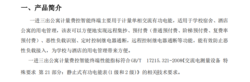 公寓计量费控智能终端性能指标符合GB/T 17215.321-2008《交流电测量设备 特殊要求 第 21 部分:静止式有功电能表(1 级和 2 级)》的相关技术要求。
