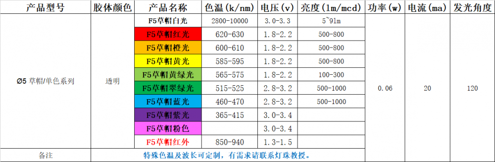 3、5mm草帽led灯珠颜色包括F5mm草帽白光,F5mm草帽红光,F5mm草帽橙光,F5mm草帽黄光,F5mm草帽普绿光,F5mm草帽翠绿光,F5mm草帽蓝光,F5mm草帽紫光,F5mm草帽粉红光和F5mm草帽红外发光二极管(红外灯)。
